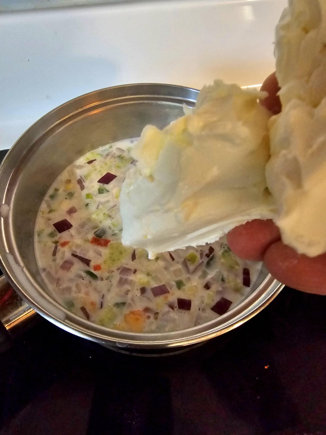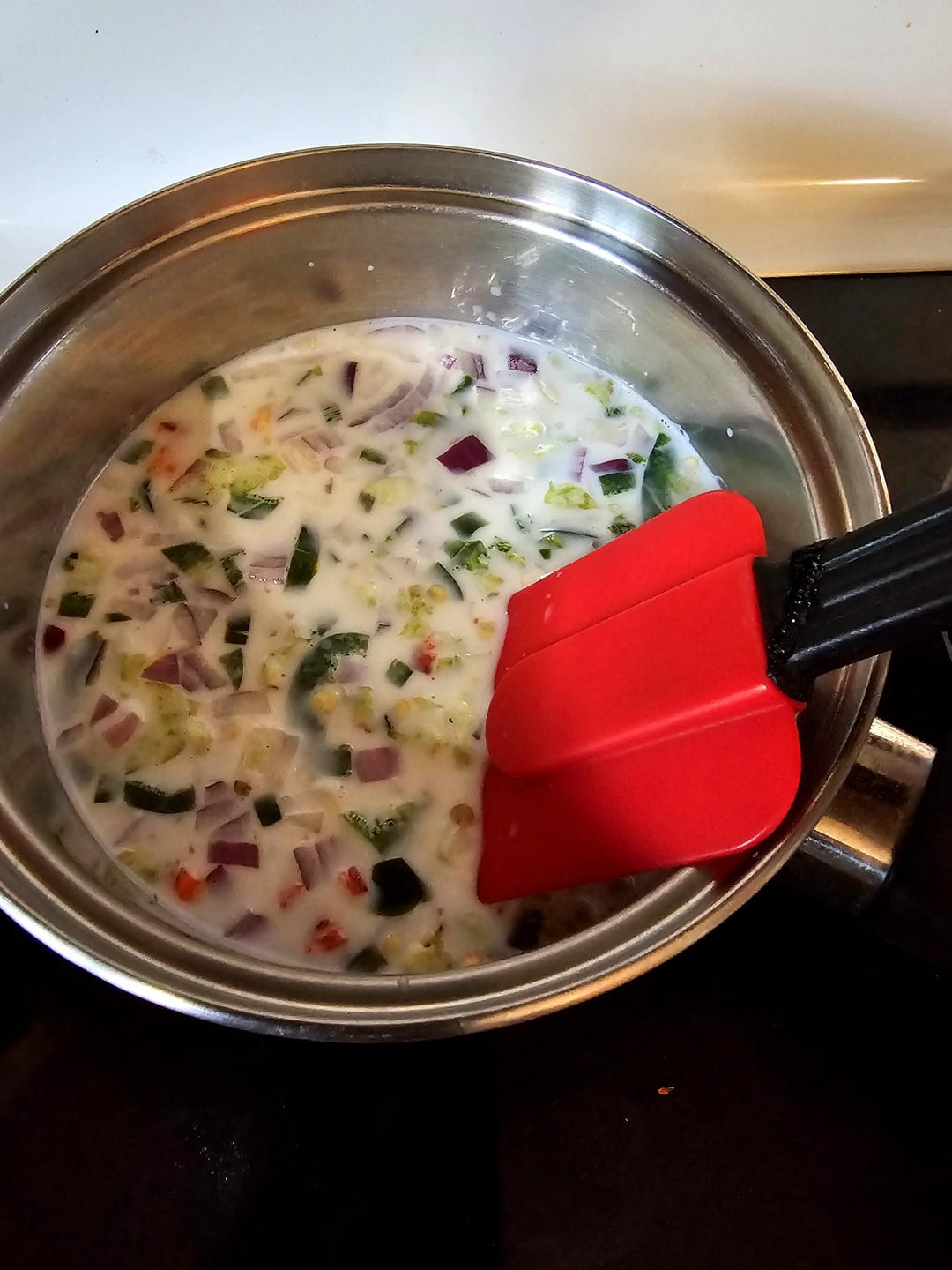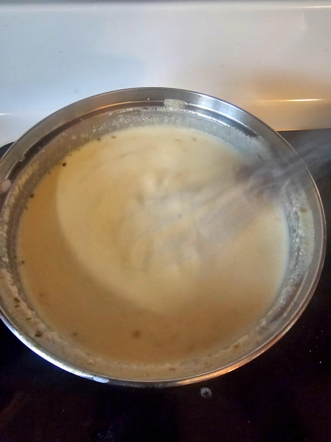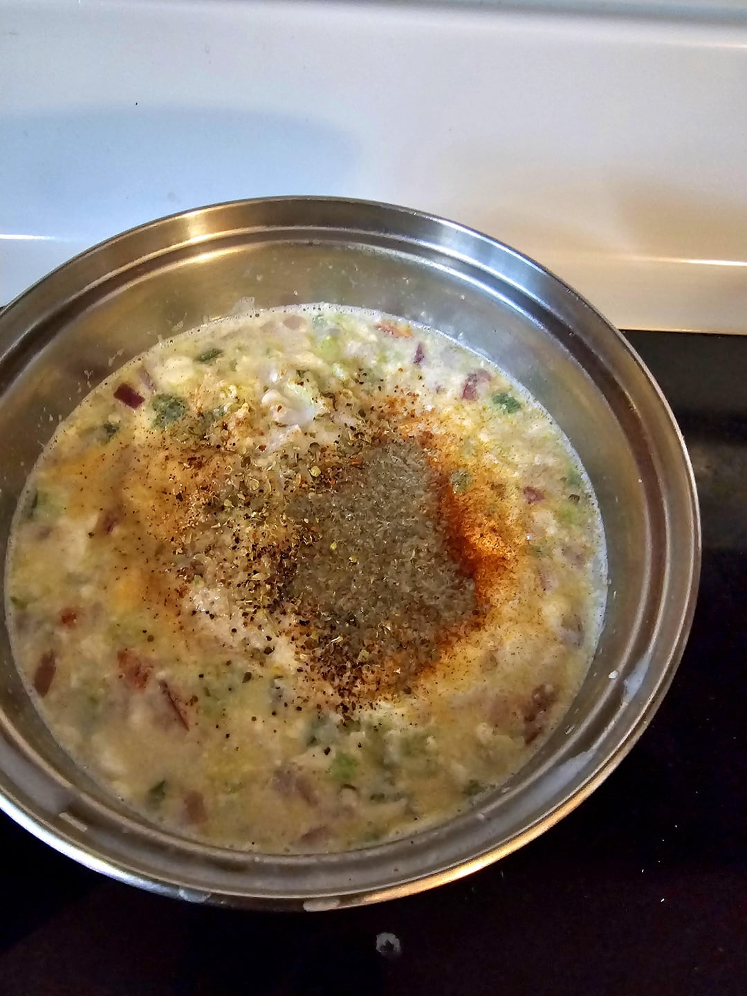 The queso I made while my balls baked. Heat some milk with red onion, garlic, red chilis, and jalapeños. When it starts to simmer add softened cream cheese….cold is fine too it just takes longer 😂…stir until it's smoothed then add shredded oaxaca (you'll probably have to buy a ball and shred it yourself), when it's all melted together season to taste with salt & pepper, cumin, paprika, chili powder, and oregano then enjoy with a smile of scallions 😁