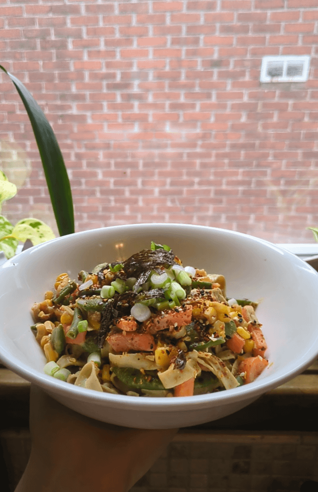 – Mix peanut butter, peanut butter powder, vinegar (1tbsp), soy sauce (1tbsp) and water (1cup) to make sauce.