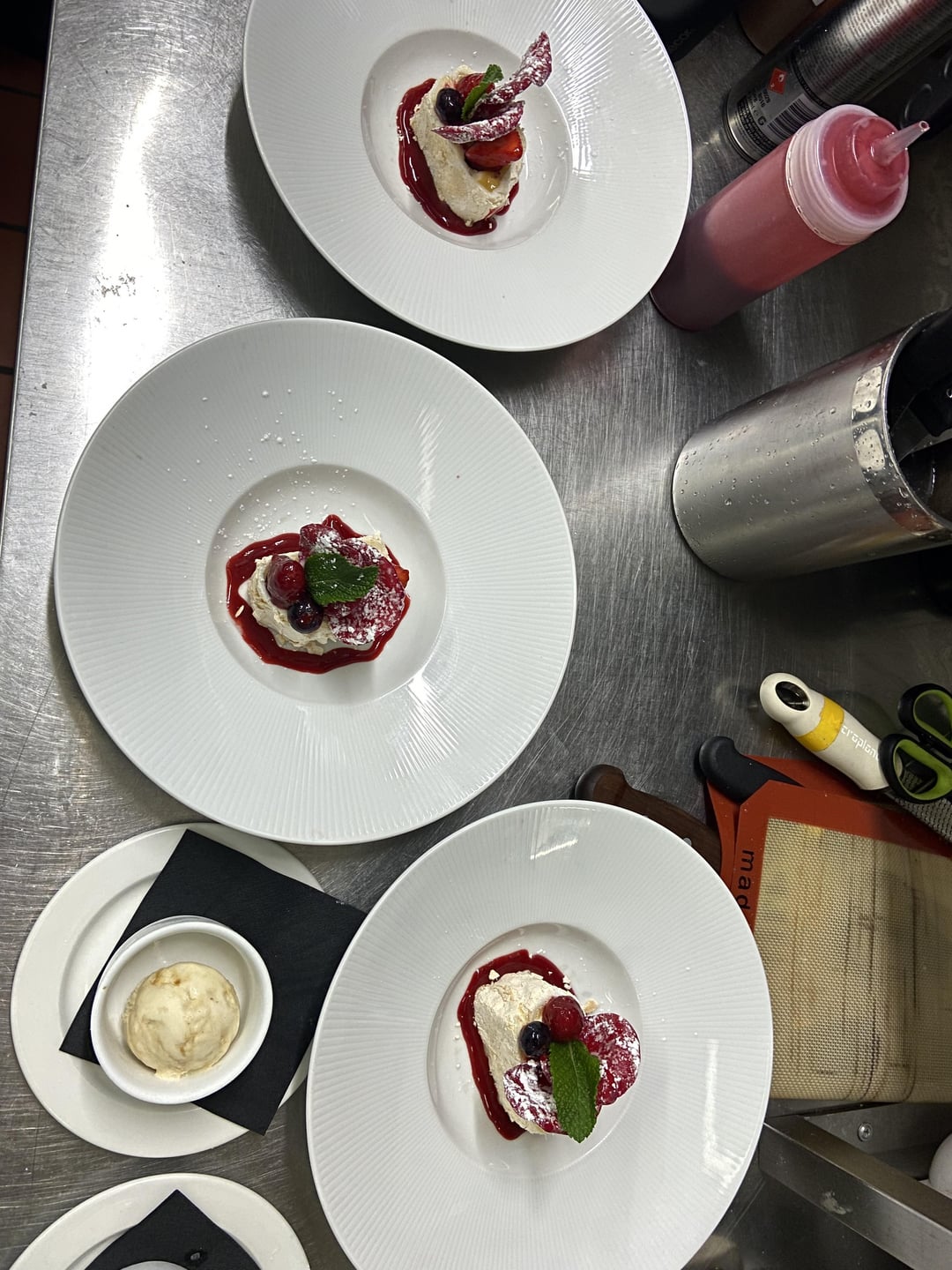 Looks great! My only tip is to handle the pavlova a little gentler, it looks like the exterior was a little roughed up. Great work, especially for 15.