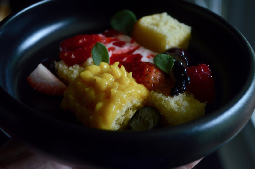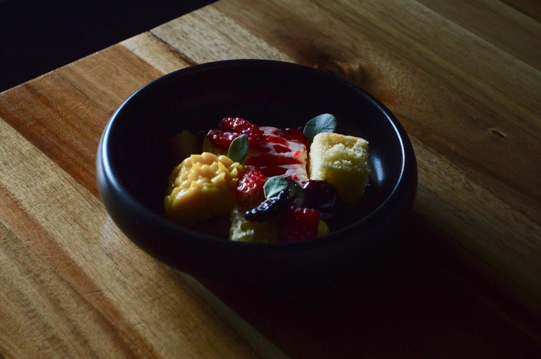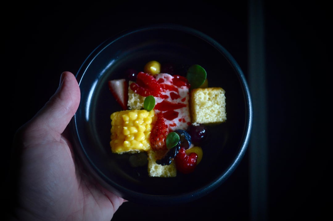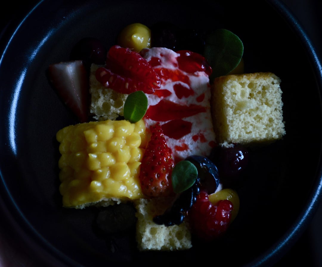 Sweet Corn and Miso Cake, Raspberry Jelly Cheesecake, Sweet Corn Pastry Cream, Blueberry Jam, Assorted Berries, Purslane by SpeakEasyChef Culinary Culinary Plating