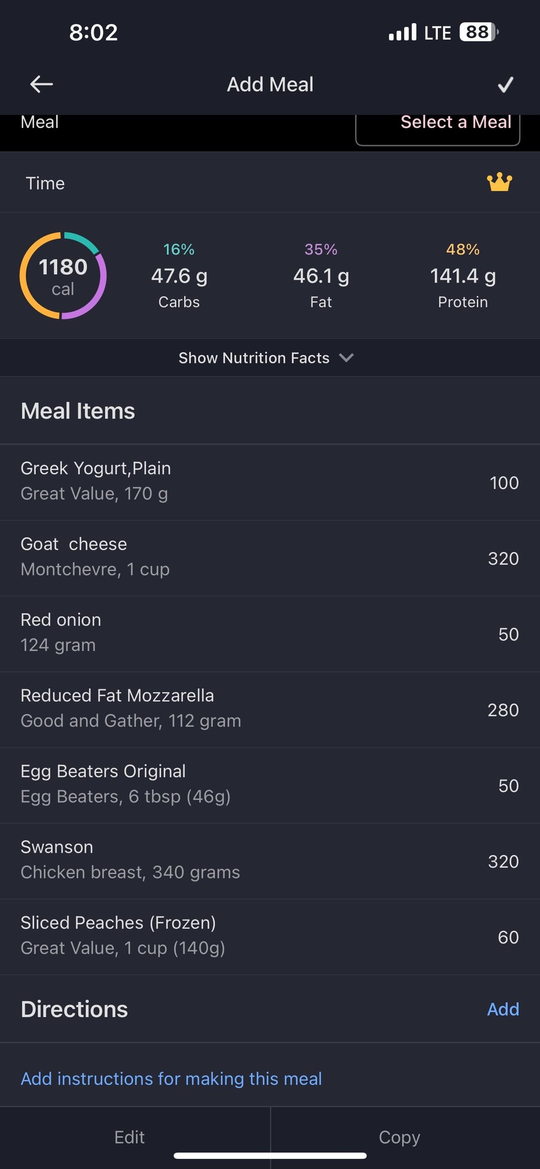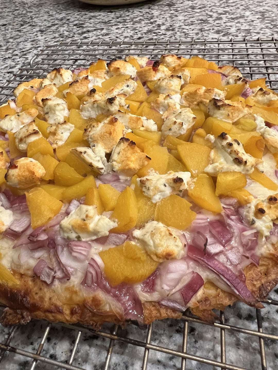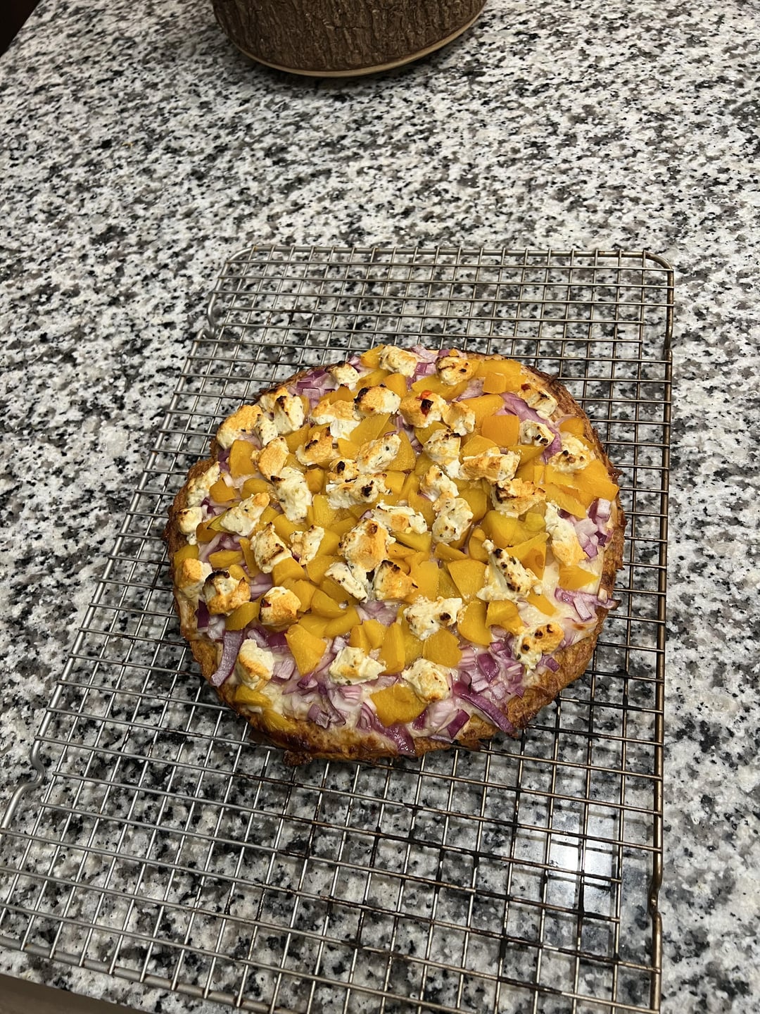 This one was awesome. Sweetness from the Peaches, bitterness from the goat cheese, with a bit of spiciness from the red onion paired immaculately. Made the pizza sauce from a combination of Plain Greek Yogurt, Smoked paprika, garlic powder, cayenne pepper powder, and salt/pepper.