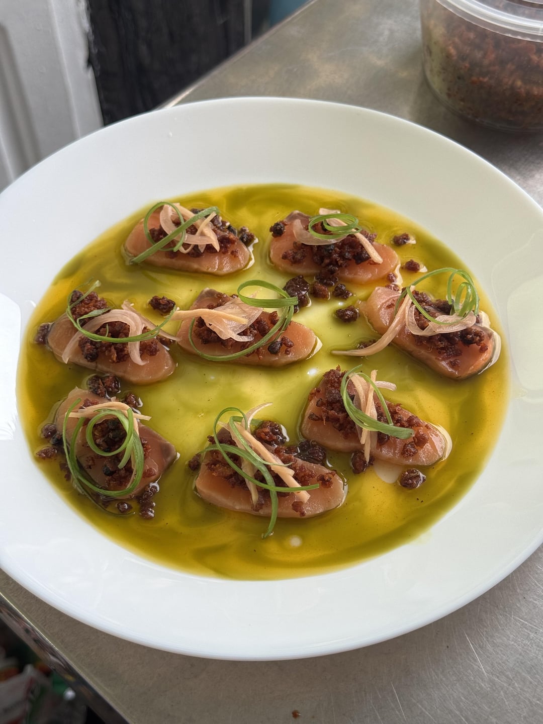 Cured atlantic salmon (60/40 salt sugar, kalamansi zest, lemon zest), lemongrass & herb oil, chicken oil (coloured with atchuete), pickled ginger & red onion, chicken skin crumble, shallots