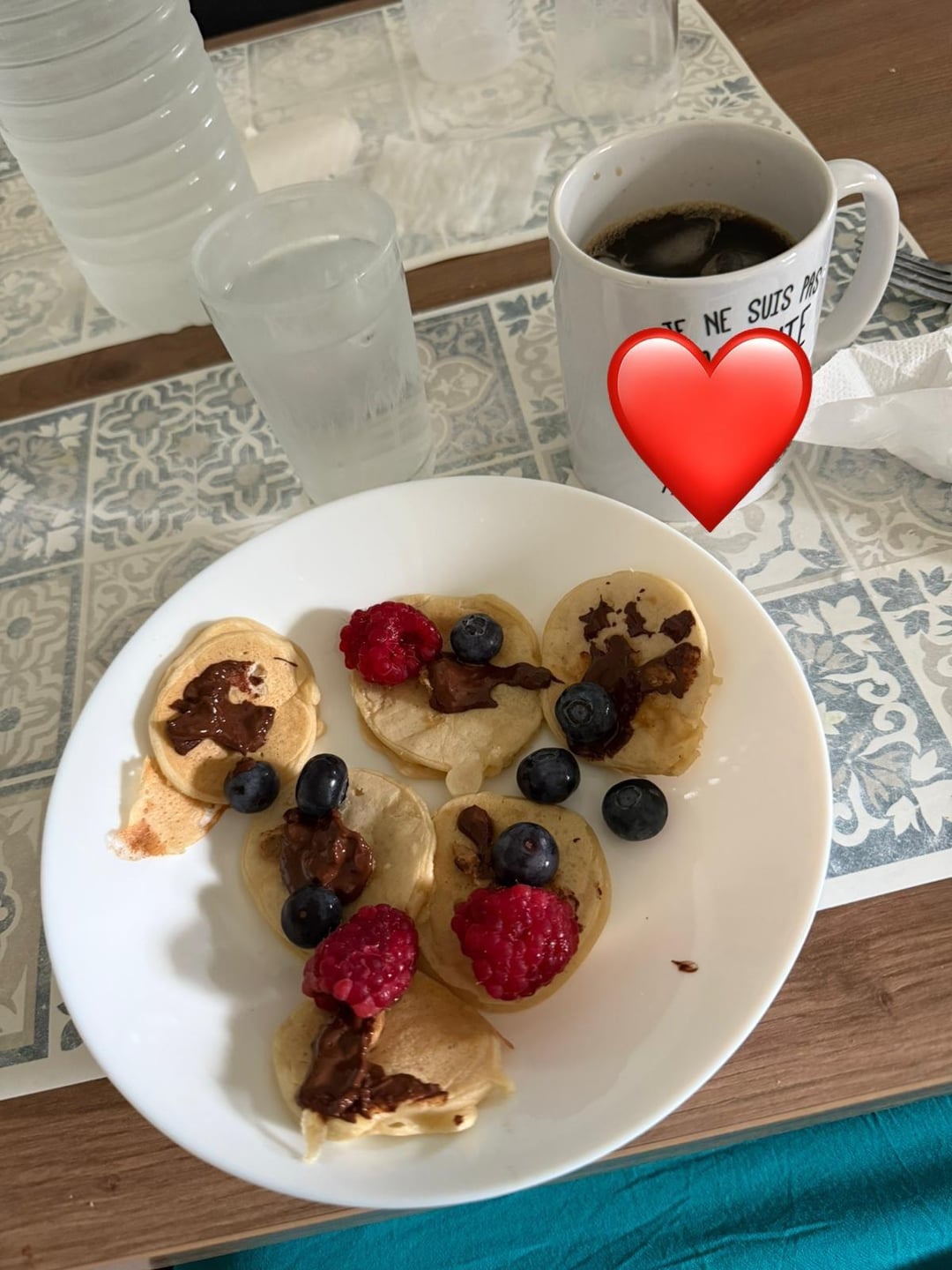 Protein pancakes for breakfirst (with peanut butter/chocolate, fruits). My coffee.