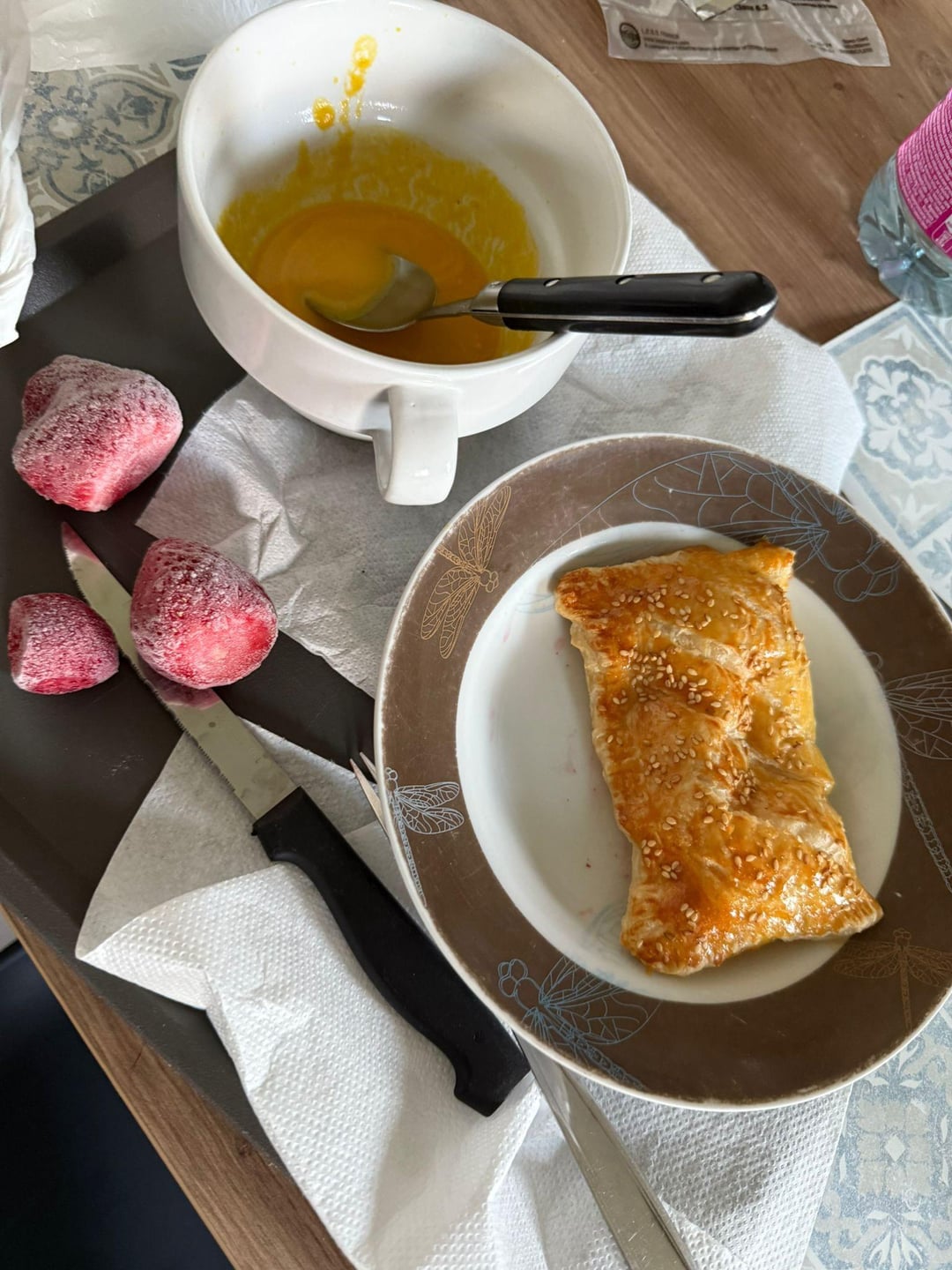 Puff pastry with cheese and ham, soup and frozen strawberries for dinner (yes i eat frozen fruits straight up like this😂)