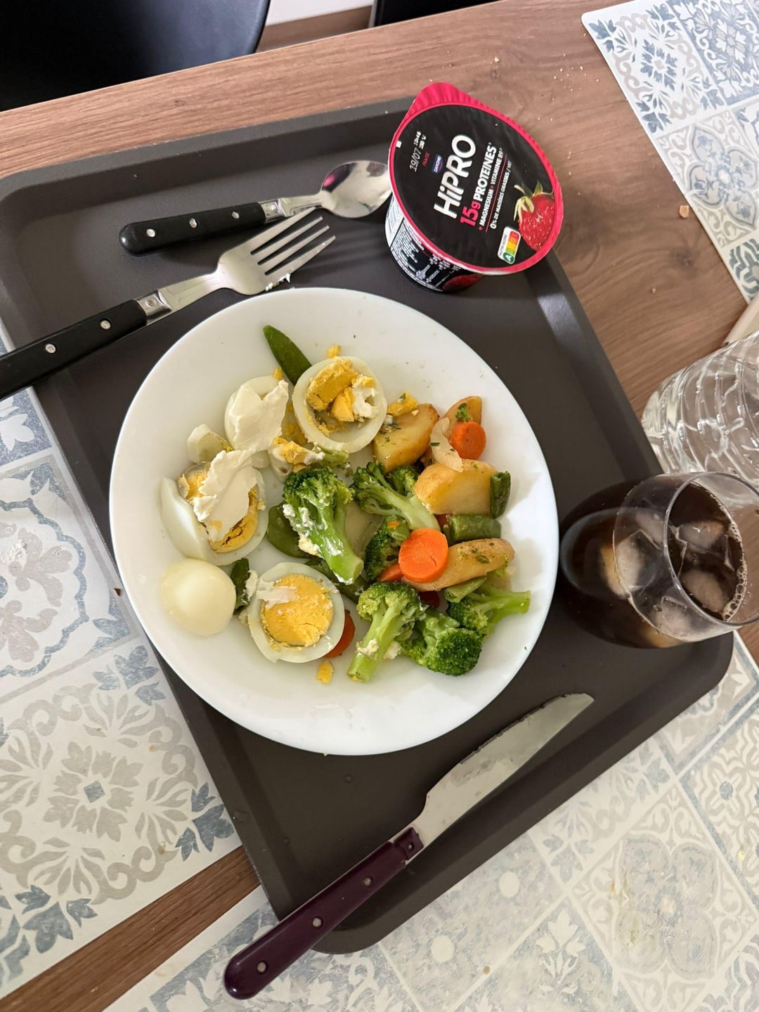 Egg, cheese, vegetables and protein yoghurt for lunch. With iced black coffee.