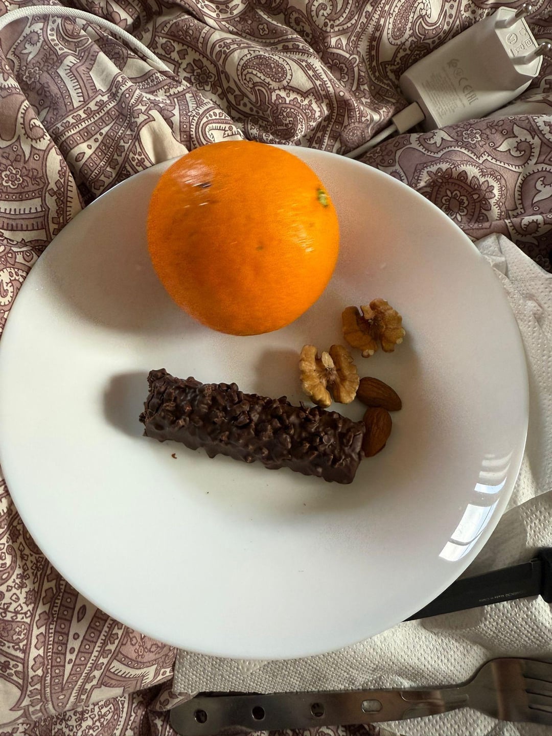 Protein bar for snack with nuts/almonds and orange. Then i had salty pop corn.