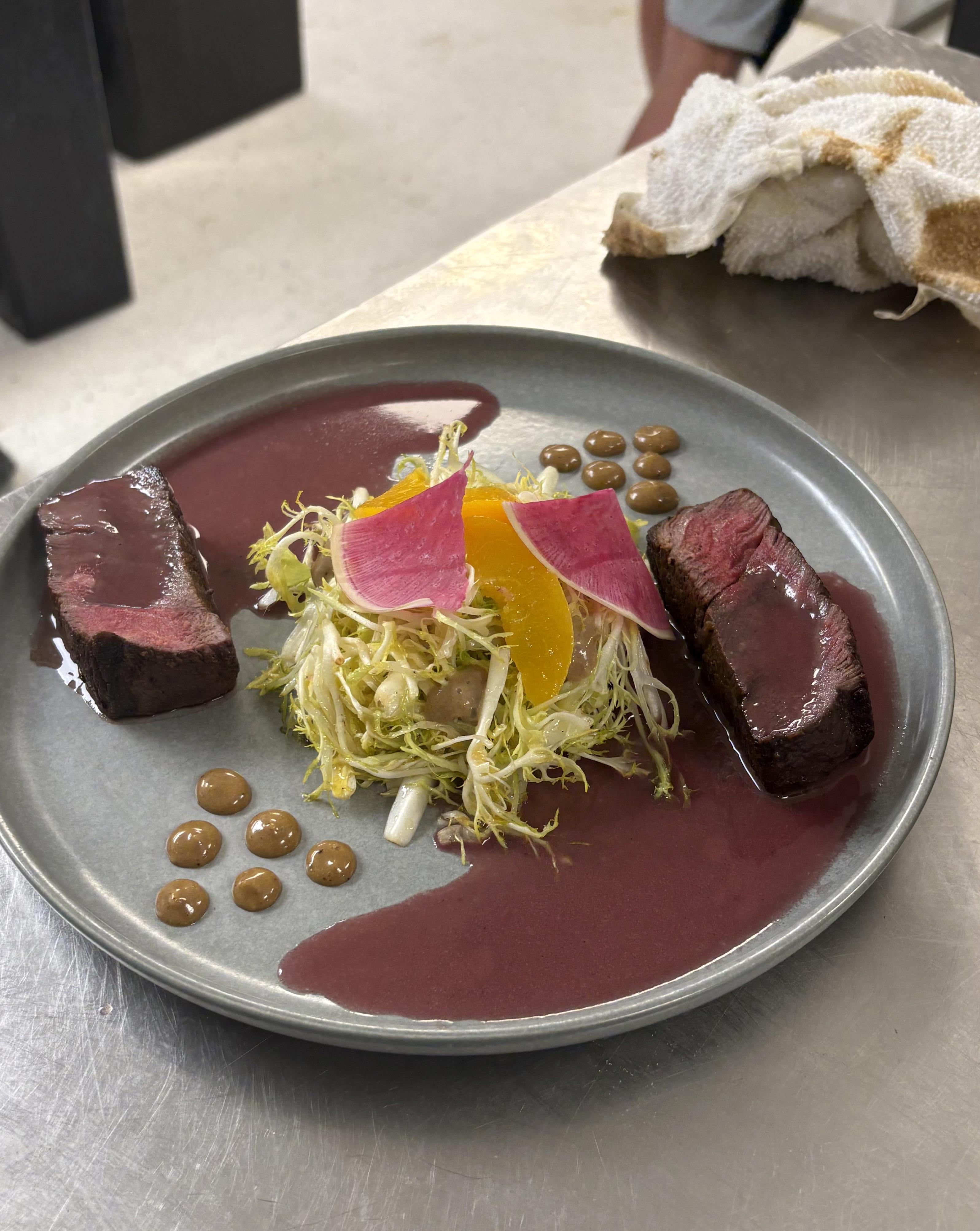 In retrospect during service started putting the beurre rouge under the filet to show off the cook.