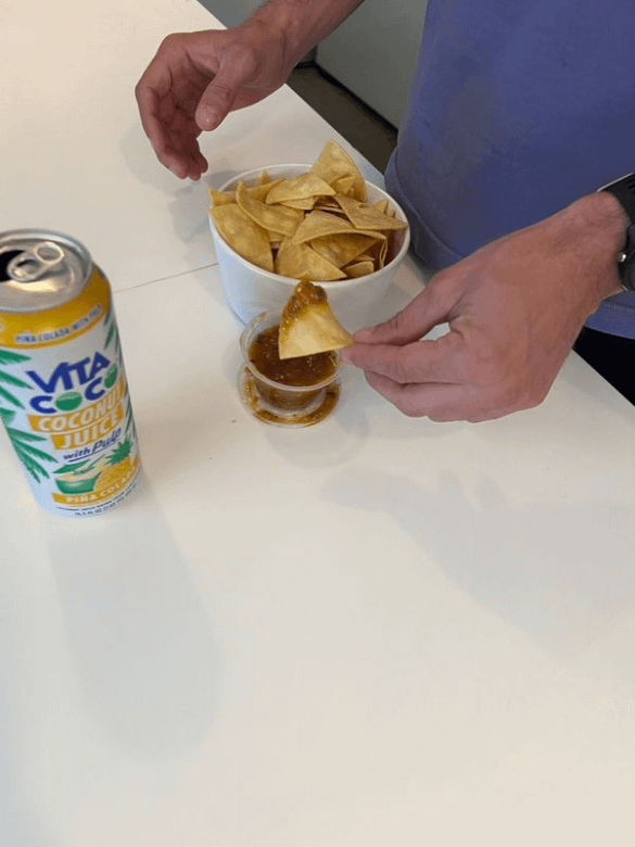 chips and salsa with vita coco pina colada coconut juice. Best combo hands down