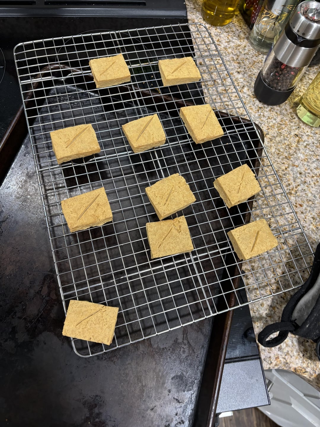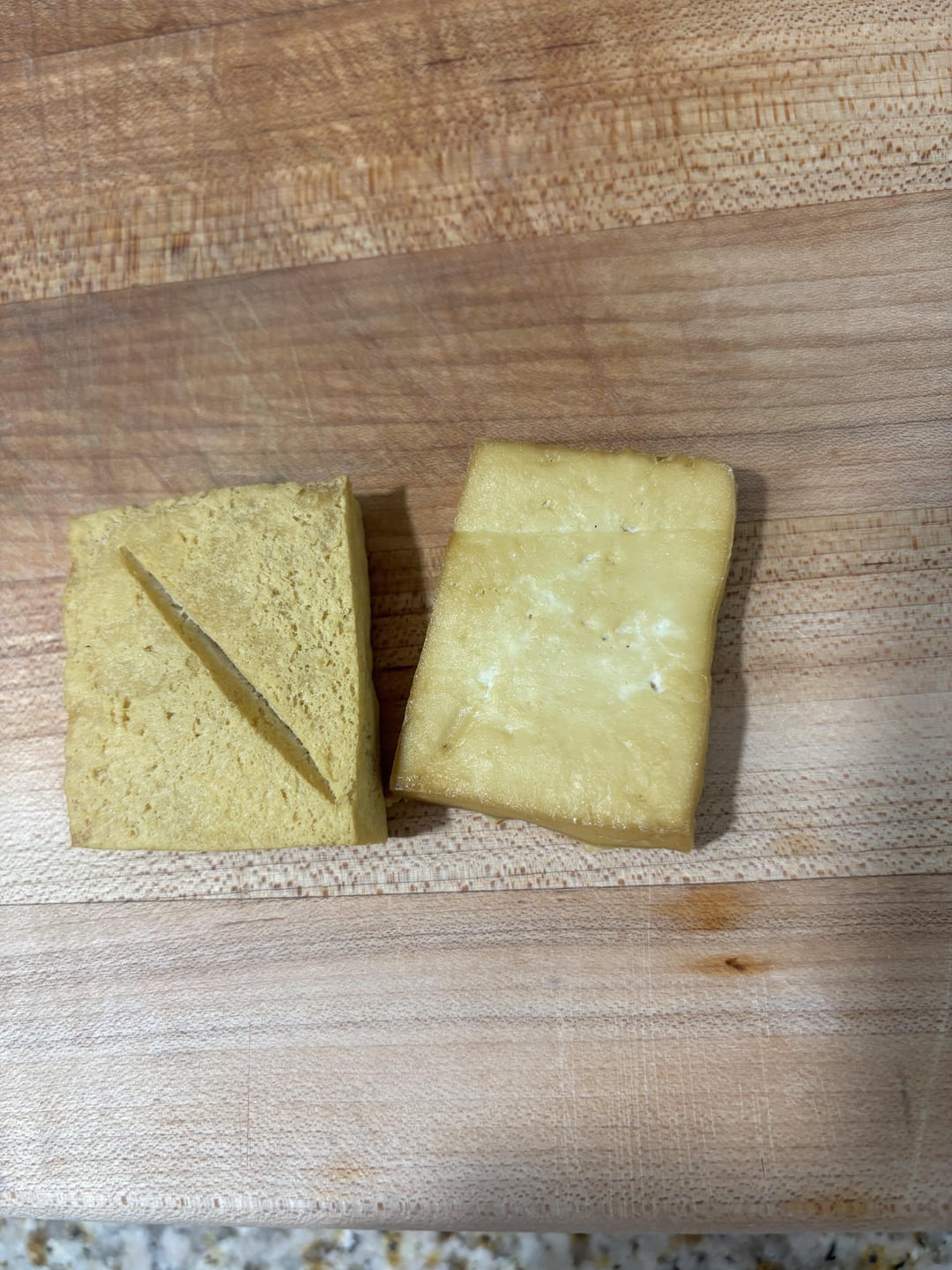 I then pressed both bricks between two sheet pans in the fridge for ~18 hrs, changing the towel half way through. The drying method was: wrap in paper towel, set on towel, set towel on bottom baking sheet, cover with another towel, set baking sheet on top, put in fridge and cover with whatever heavy ish containers of food were in there.