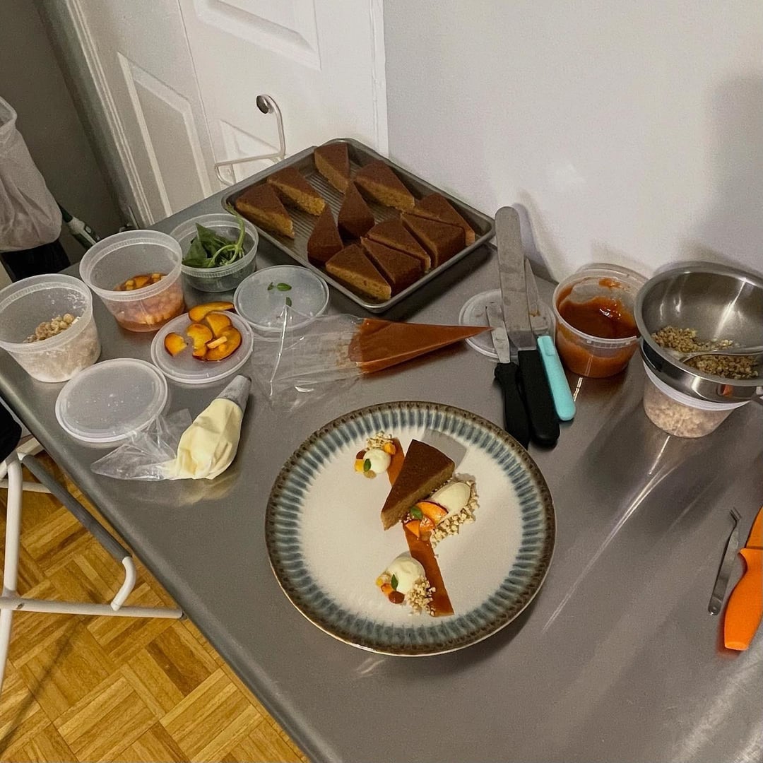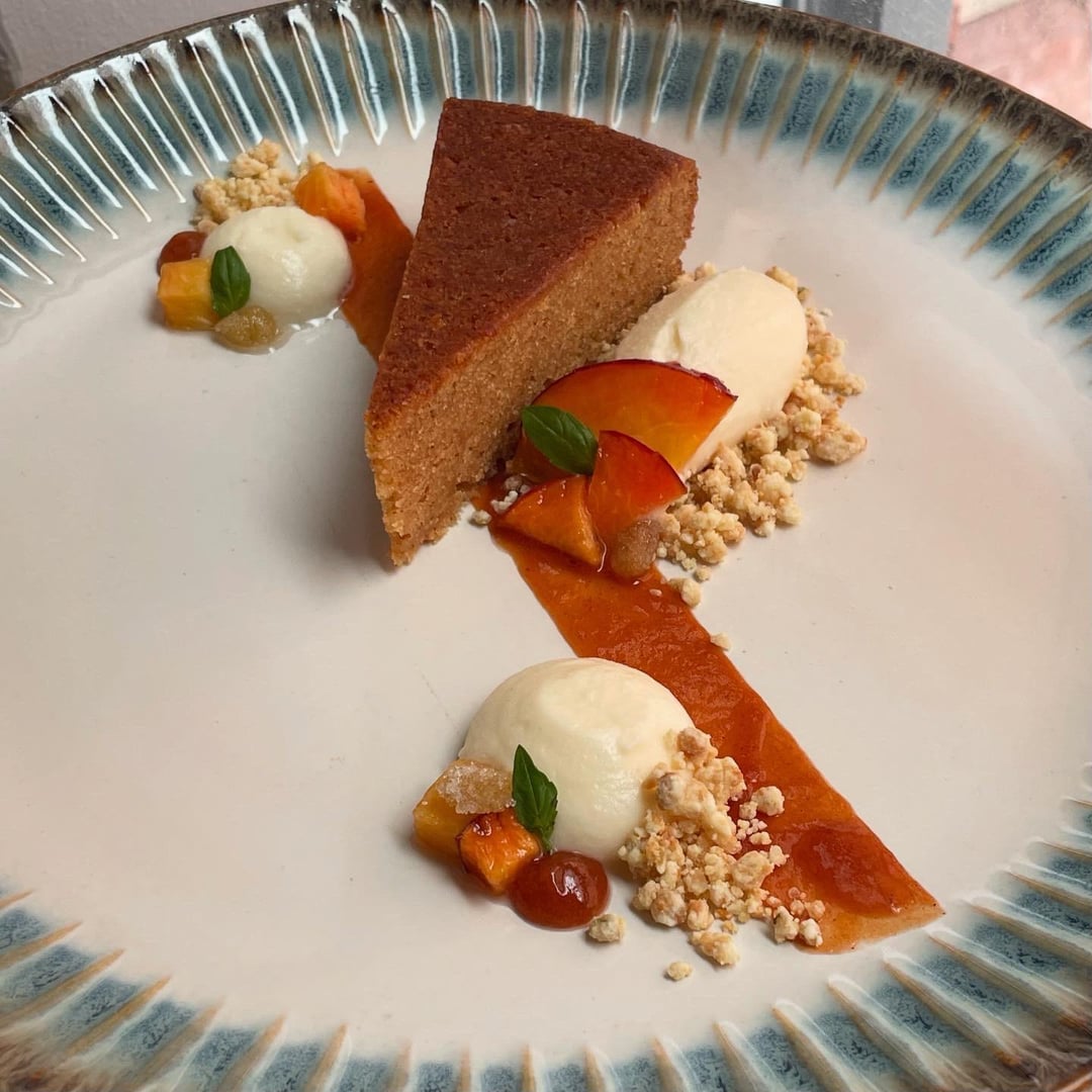 Toasted milk + brown butter cake, ricotta whip, roasted peach jam, basil milk crumb, ginger macerated peaches, candied ginger, micro basil