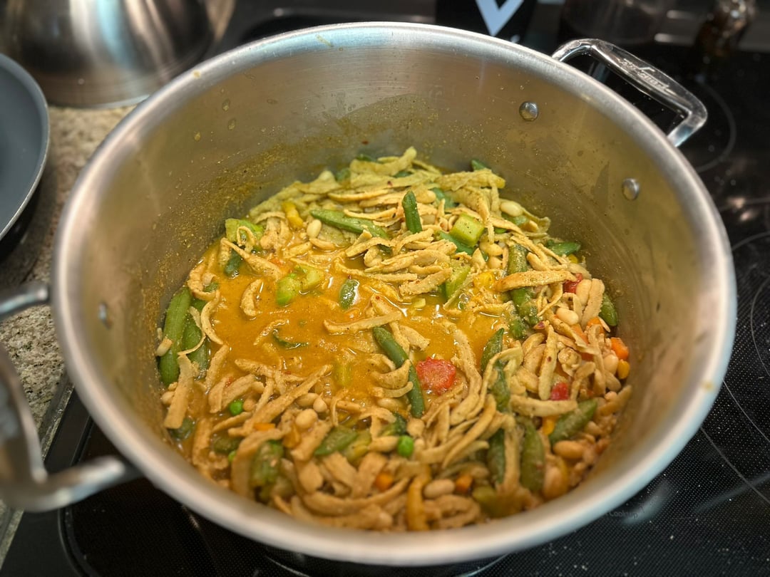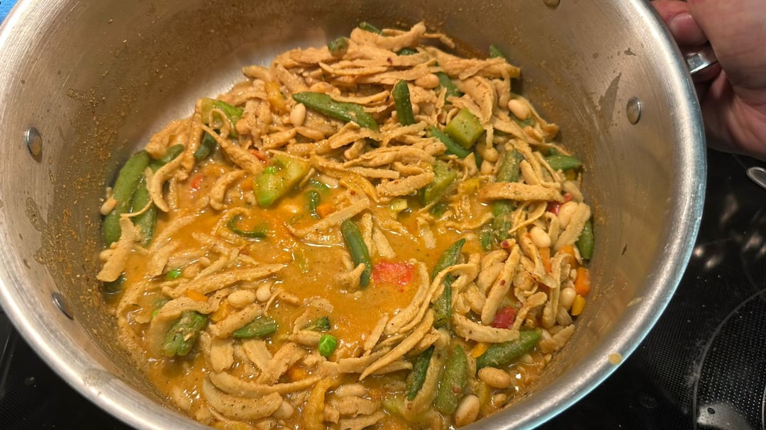 – Once boiling, add your Say Grace Shreds, sugar snap pea stir-fry, nutritional yeast, great northern beans, and your spices of choice to taste. Stir all ingredients to combine and cook on medium heat until Say Grace is chewy.