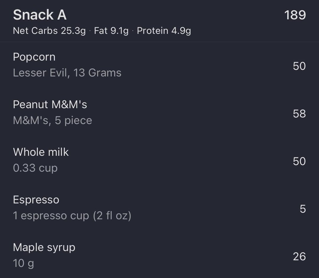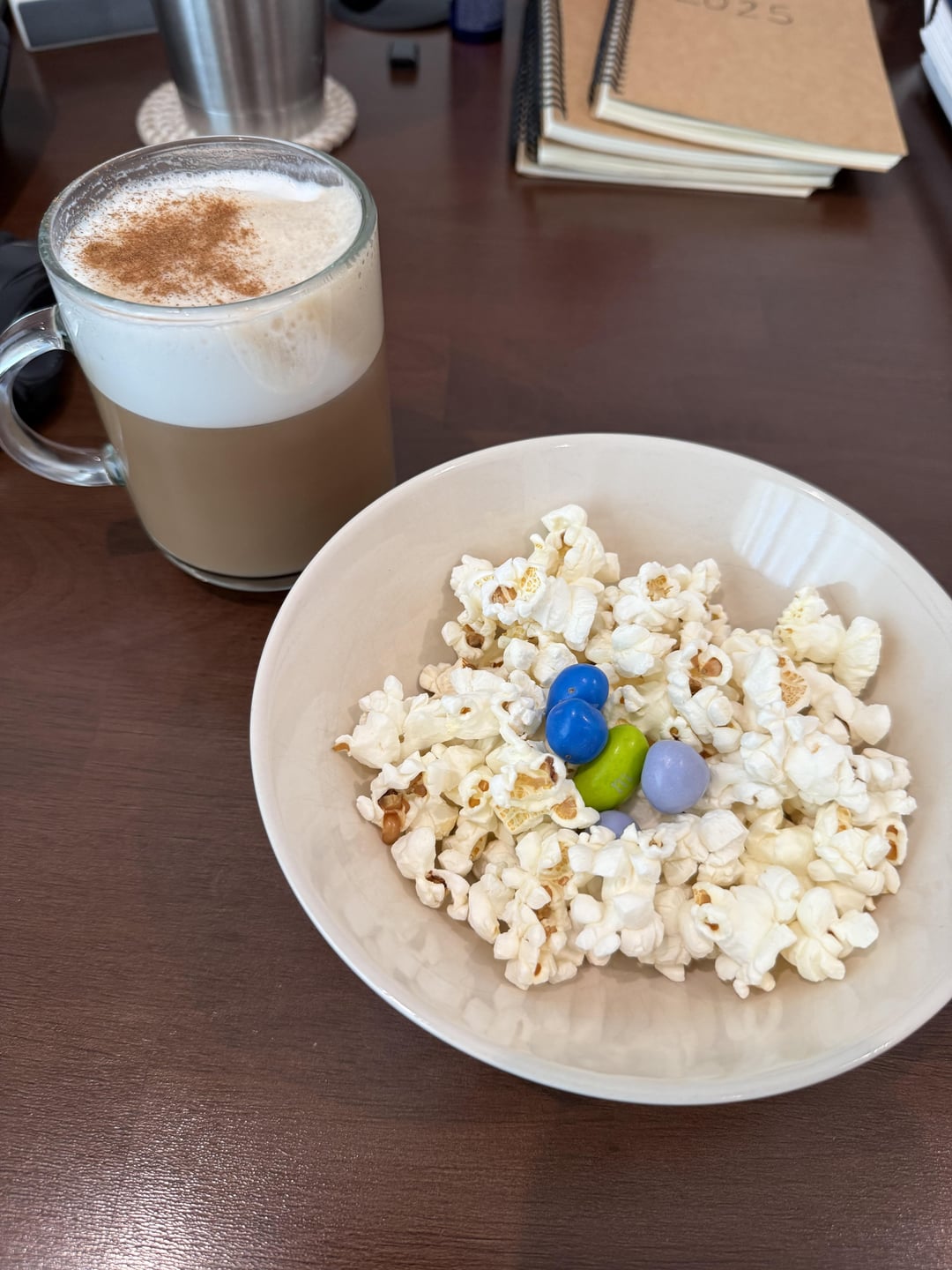 Snack 3p – popcorn, 5 peanut m&m and a maple cinnamon latte