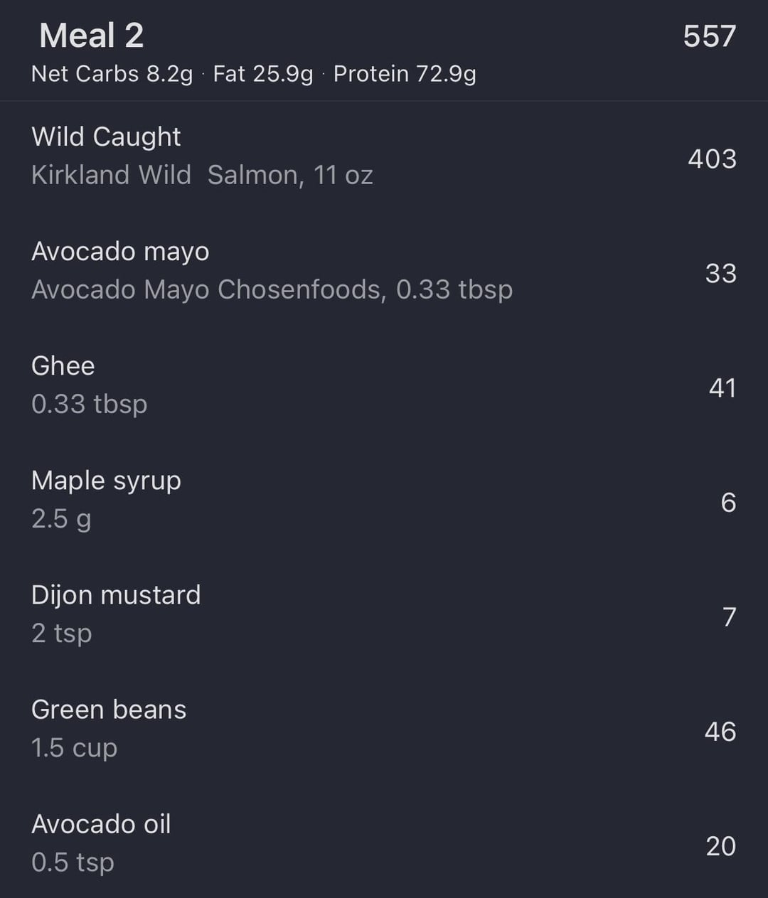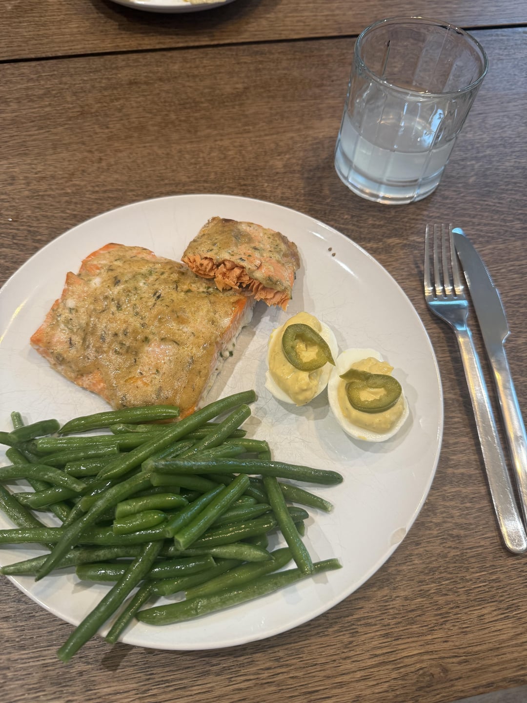 Dinner 6p – Creamy Dijon Maple Salmon with green beans and 2 deviled eggs (made with Greek yogurt)