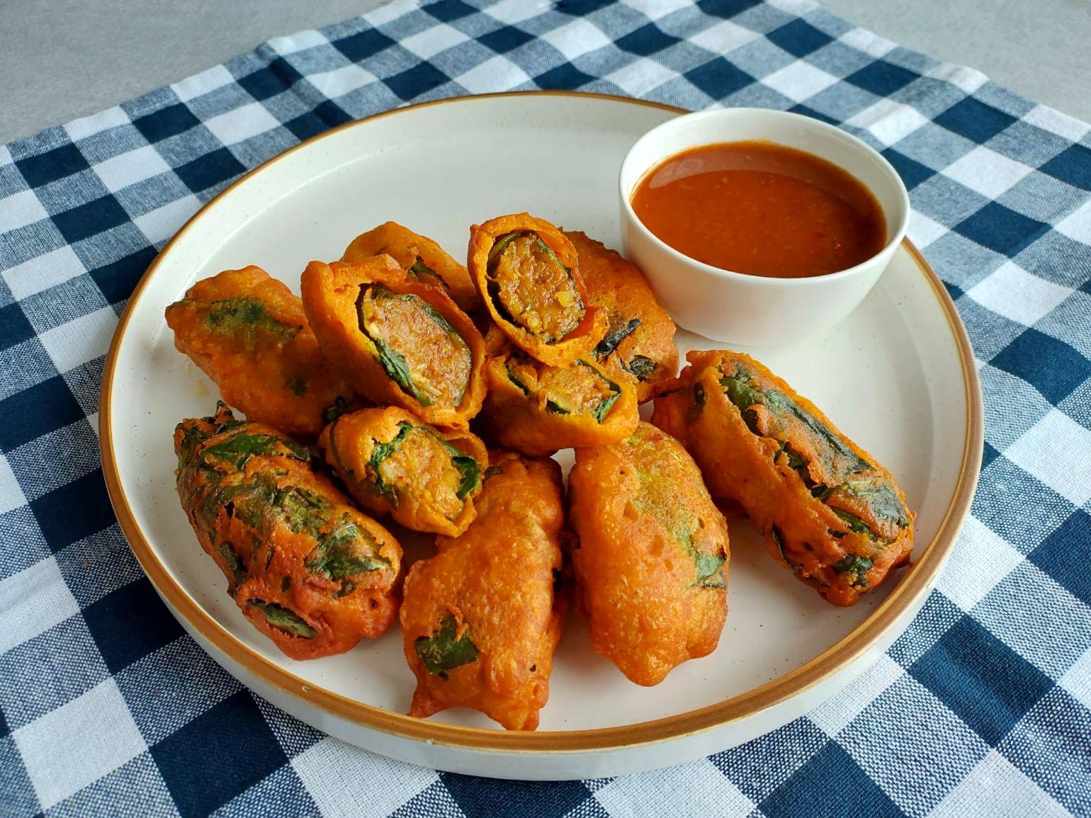 Blanch the spinach leaves in hot water for 10 seconds if they are too stiff. Remove and pat [dry.In](http://dry.In) a bowl, mix mashed potatoes, crushed peanuts, green chilis, 1/2 tsp red chili powder, garam masala powder, salt, and coriander leaves. Mix gram flour, rice flour, 1/2 tsp red chili powder, turmeric powder, and salt in a bowl. Add water gradually to make a lump-free, medium-thick batter. Place a spinach leaf vertically on a flat surface. Add a spoonful of the stuffing on the leaf at the top end. Roll tightly like a spring roll. Dip each roll in batter to coat evenly. Slide the rolls into the hot oil over a medium flame and fry until crispy and golden brown. Serve hot with green chutney or sweet chili sauce.