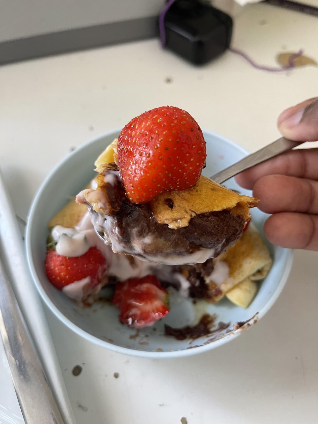 Anyways, I started off by blending a can of mixed beans and separating them into sweet and savoury. In the sweet one I added: half a medium banana, sweetener, 3 tbsp cocoa powder, 2 tbsp of chia seeds and honey. Left it to thicken overnight. Used half of it to fill the smaller pancake.
