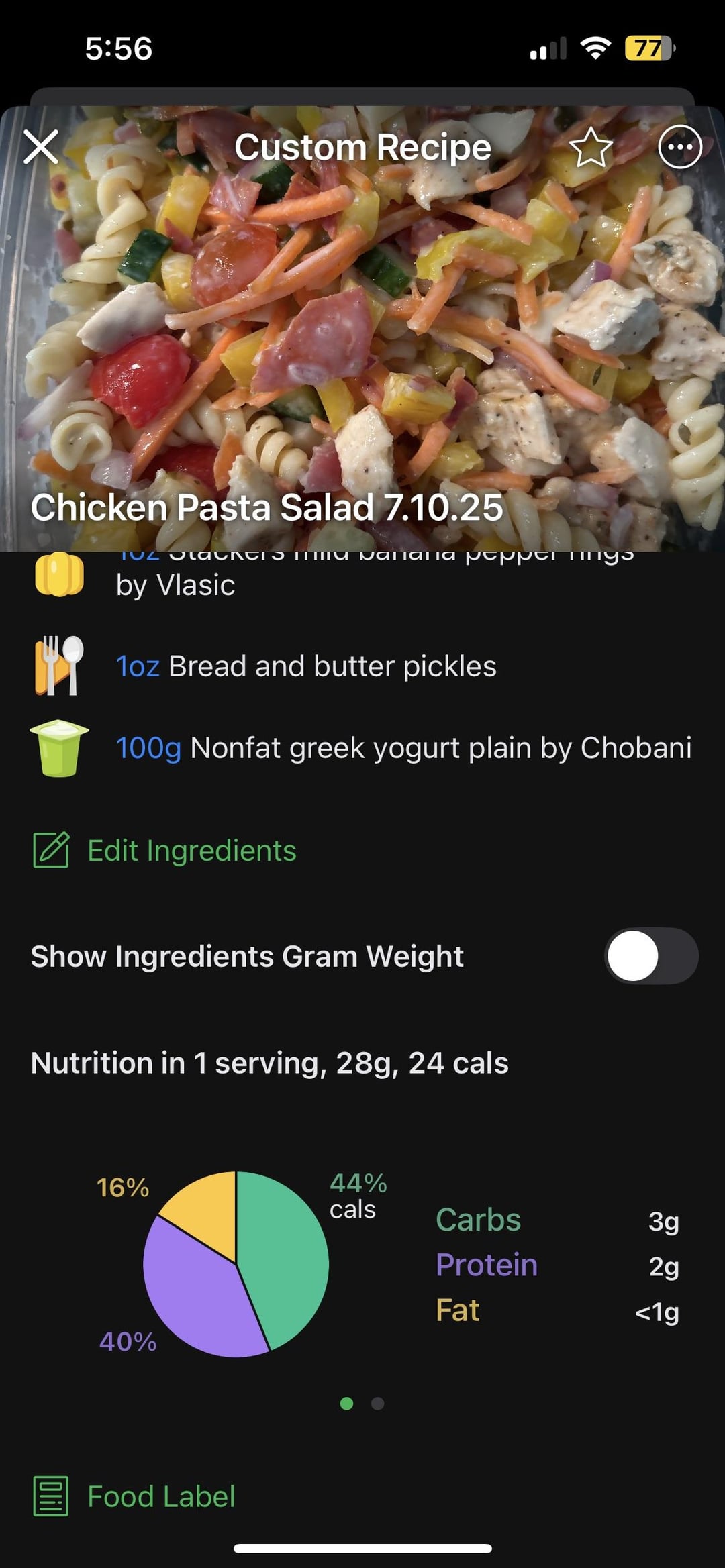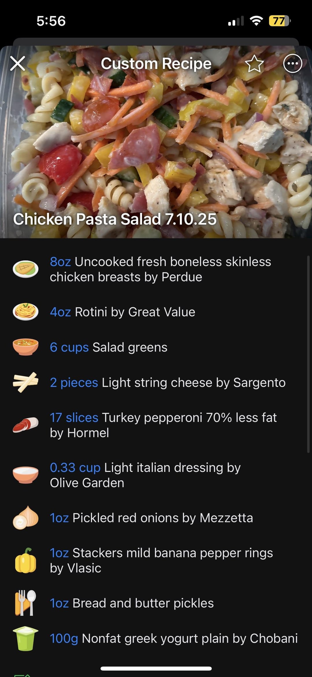 I put the recipe in for one serving being one ounce so I can easily measure when I make a bowl, total recipe makes 44oz/44servings of prepared food (full recipe calories 1,039). The ‘salad greens’ are cucumber, red onion, tomato, bell pepper, and carrots but I don’t worry about weighing veggies like those so I add an estimate of volume.