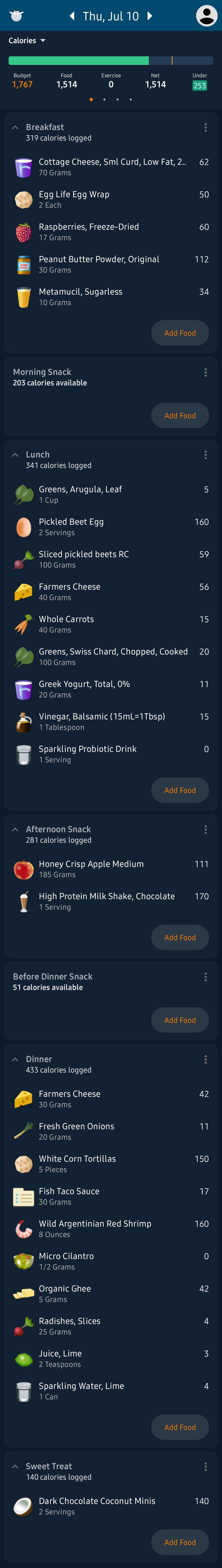 I get ~10k steps and do 30 min on the stair climber daily, so I might need to increase calories as I increase my exercise/fitness goals. Currently my day is: 2-4 cups black coffee (nothing after noon), breakfast around 9:30am, lunch around 12:30, afternoon walk, snack when I get back to my desk, stair climber after work and then dinner around 7:00 or 8:00 if it is a busy evening, and a sweet treat before bed around 9:30pm.