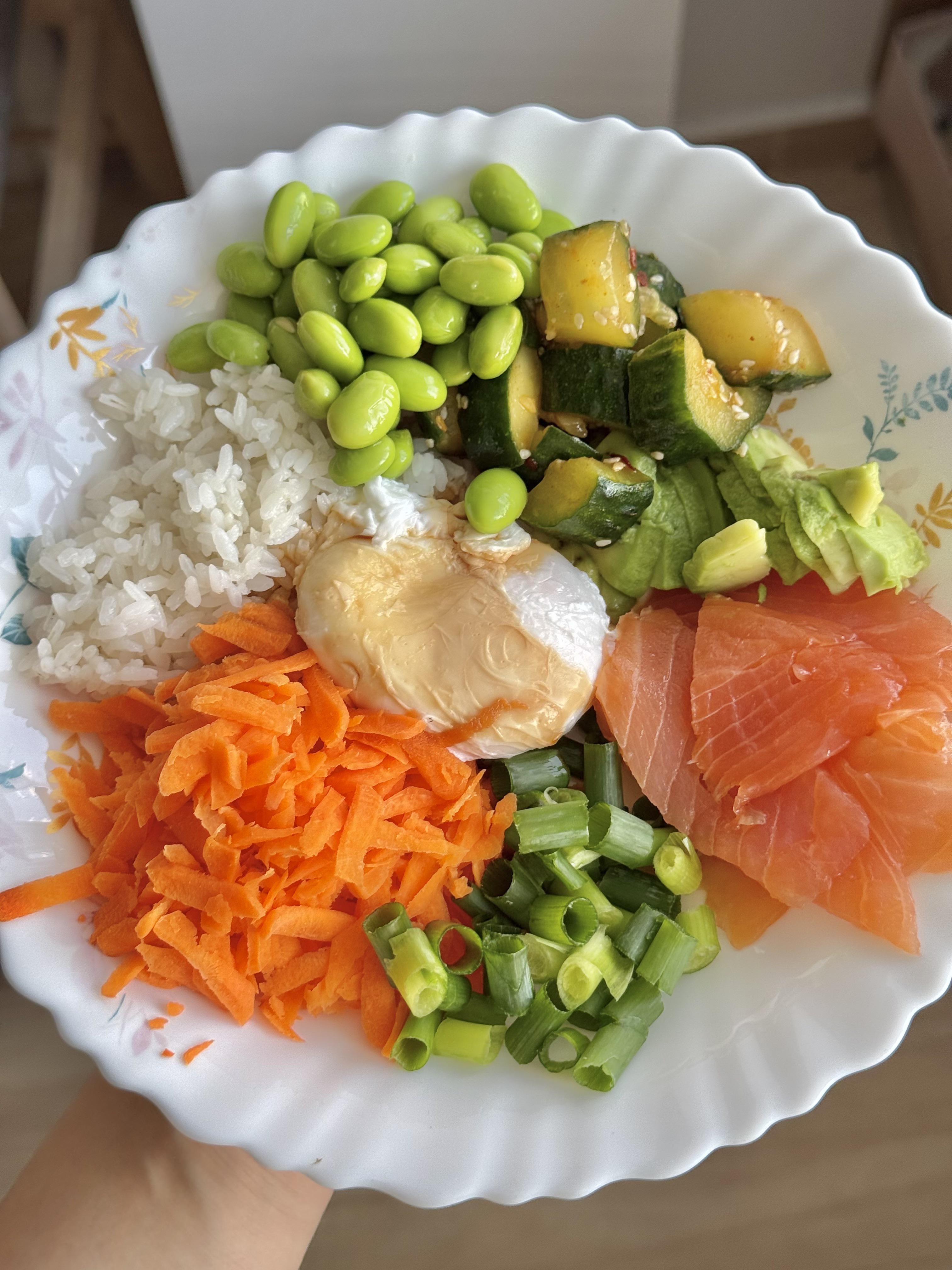 547 kcal Poke Bowl: smoked salmon, poached egg, sushi rice, edamame, avocado, asian cucumber salad, shredded carrot, green onion, soy sauce (29g protein, 53g carbs, 27g fat) by Byssine 1500 Calorie 1500 Calorie Diet 1500 Calorie Meal Plan 1500 Kcals 1500 Kcals a day 1500 Kcals per day 1500 Kilocalorie 1500 Kilocalorie a day 1500 Kilocalorie per day 1500isplenty