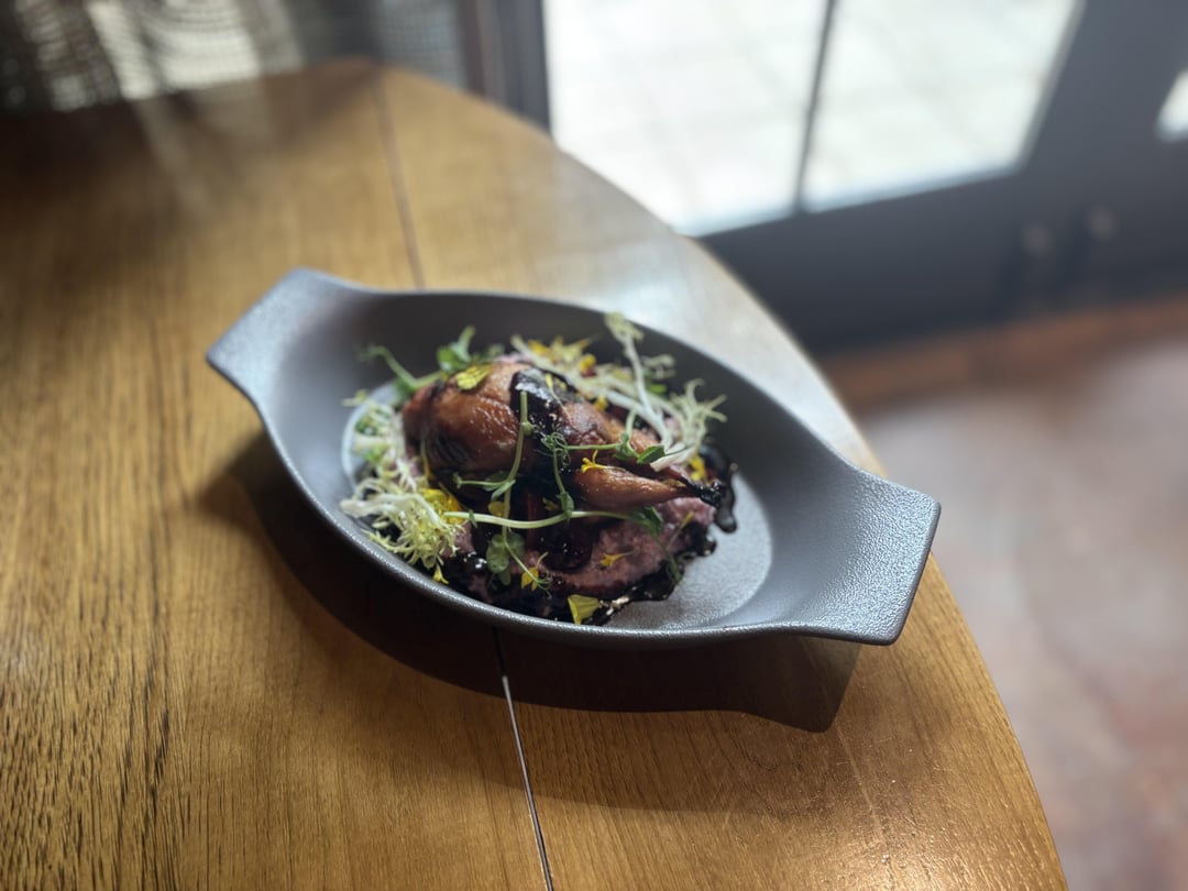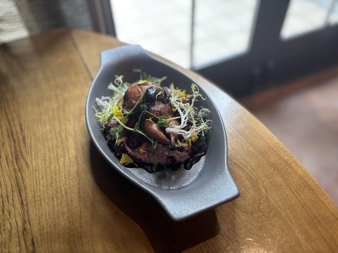 Cajun seasoned duck boudin Sweet tea brined quail Duck fat grits with goat cheese Pickled cherries Cherry Jus Frisée salad by Spyblitz Culinary Culinary Plating