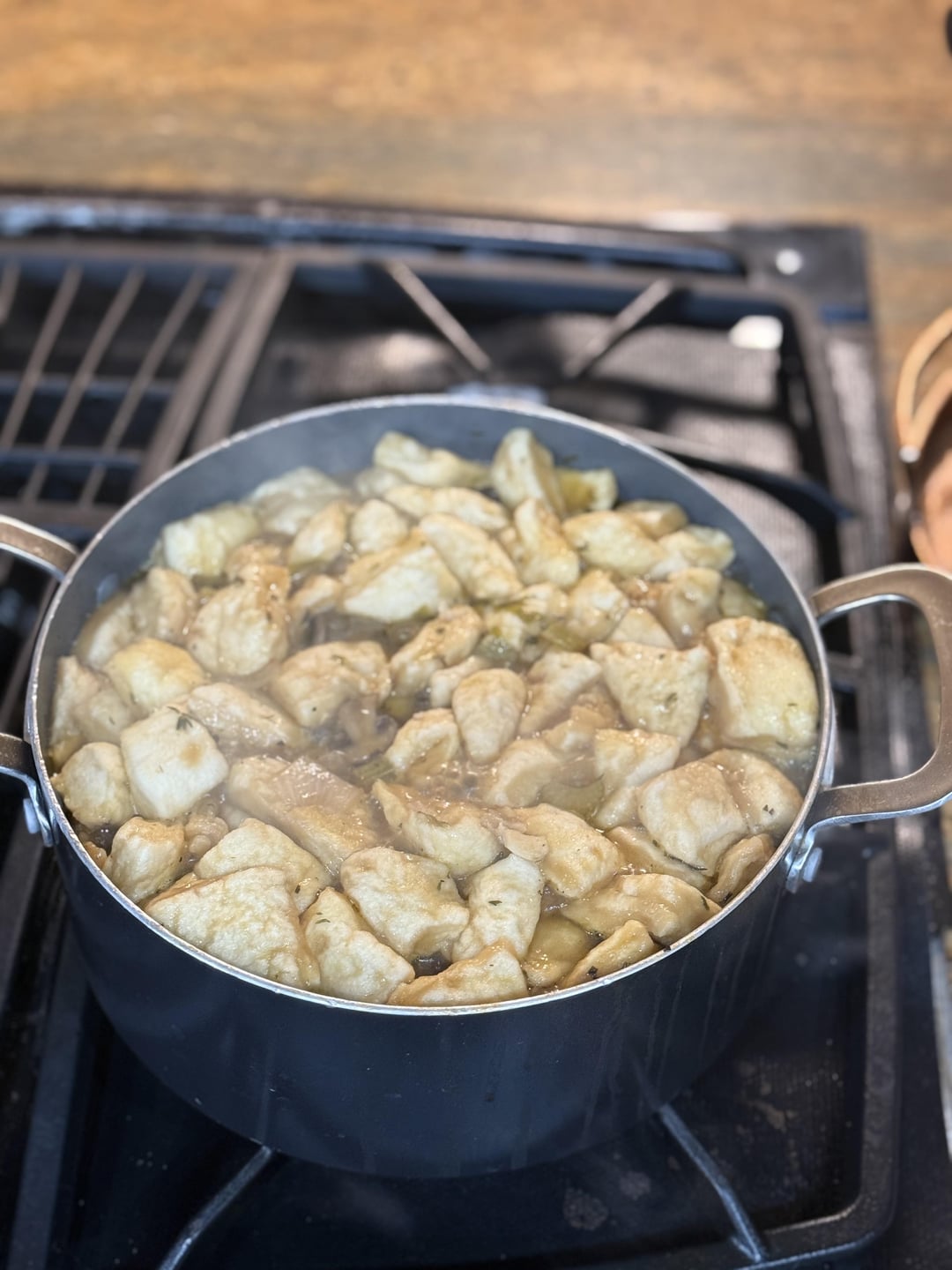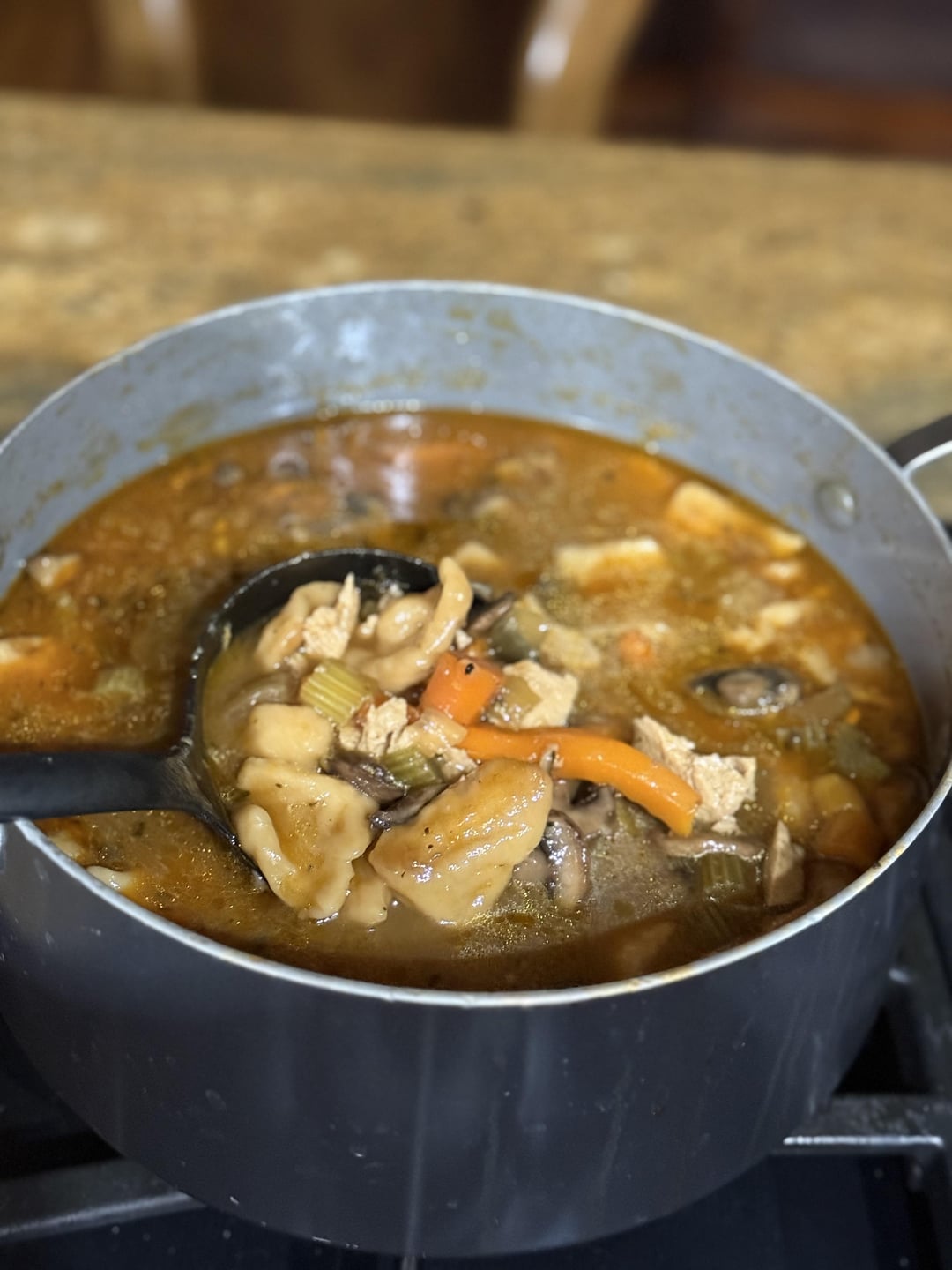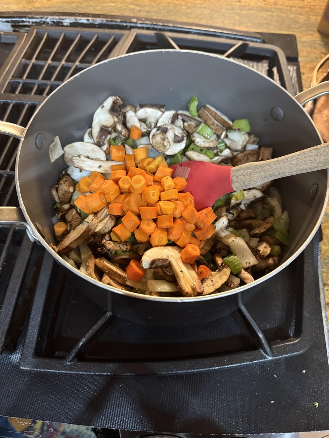 About 10 oz on baby portobello 8 oz or so of each: Carrots, celery 1 large yellow onion 3-4 tablespoons of fresh thyme 9 cups of veg stock 1 tin of biscuits, flattened out and cut into 1” squares 1 package of beyond chicken Salt and pepper to taste 2 fresh garlics, crushed