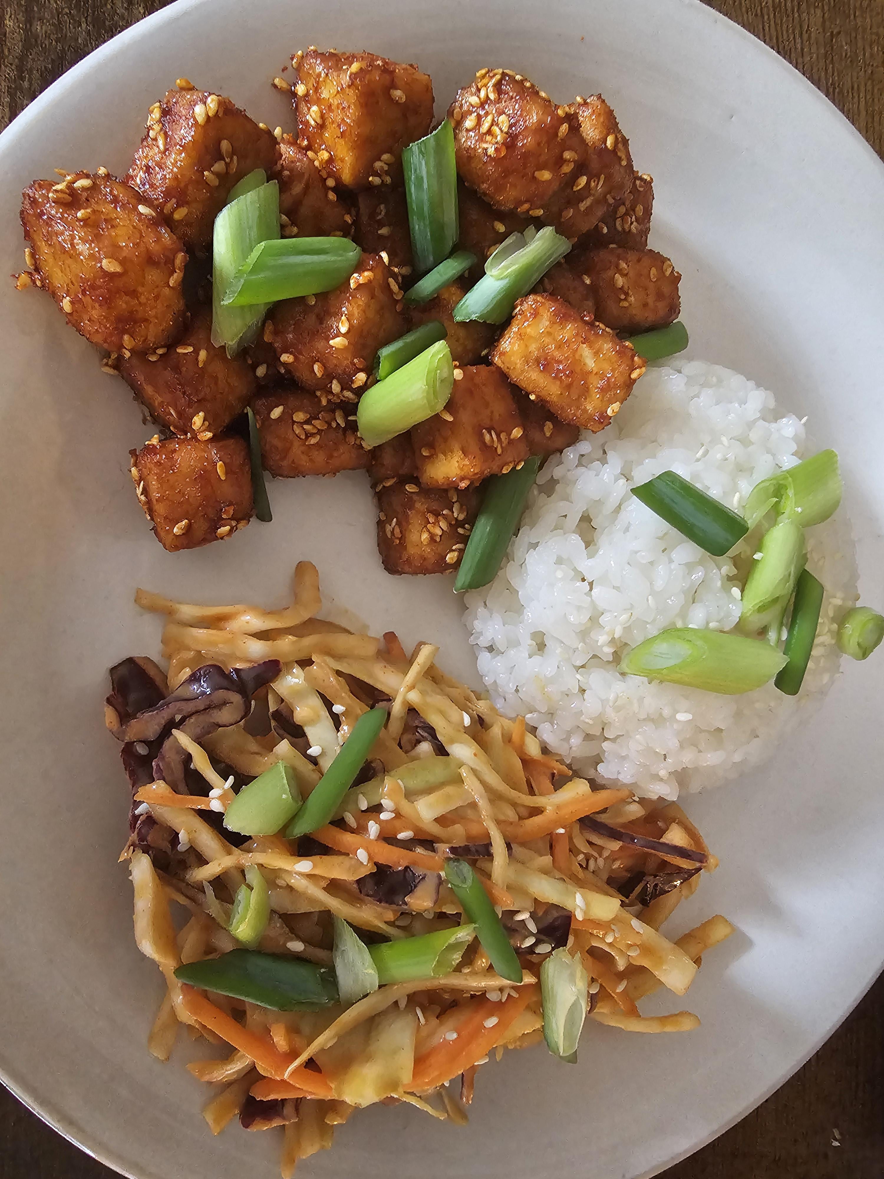 Korean-style airfryer tofu with sushi rice and spicy slaw ♡