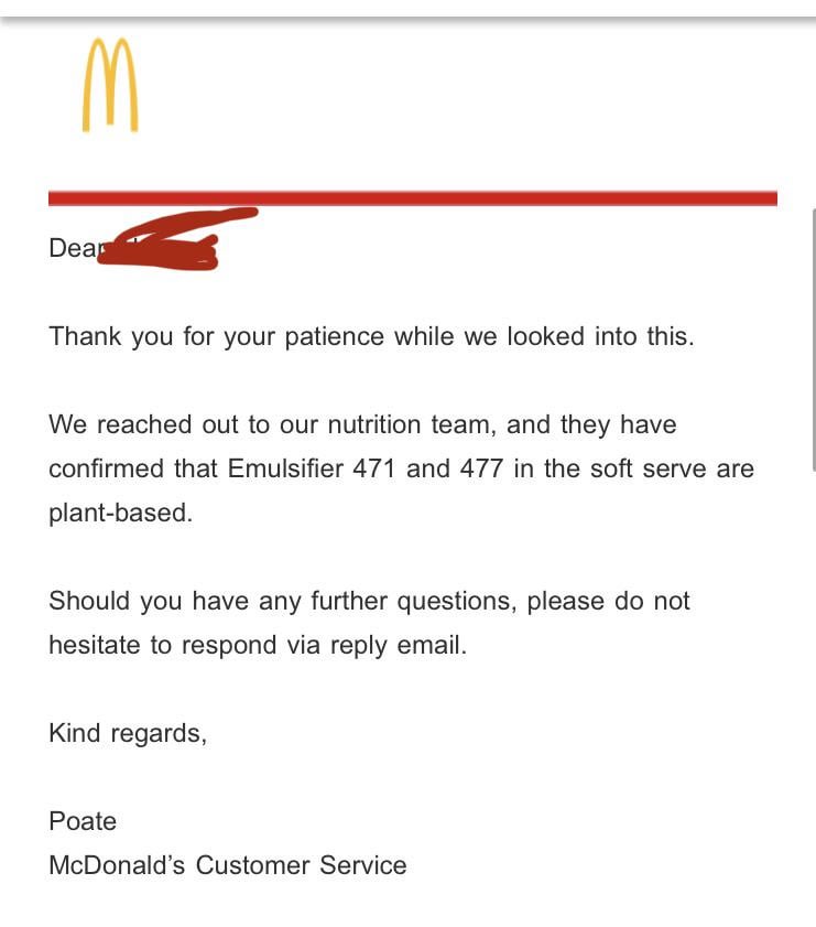 For the LONGEST time, I avoided soft serves (even though I love them) because I thought they had some animal based fats or gelatine in them. After emailing both Hungry Jacks and McDonalds, I have confirmed that their soft serves are in fact vegetarian and the Emulsifiers 471 and 477 are sourced from plant based sources! I hope fellow Aussie vegetarians find this useful 🙂