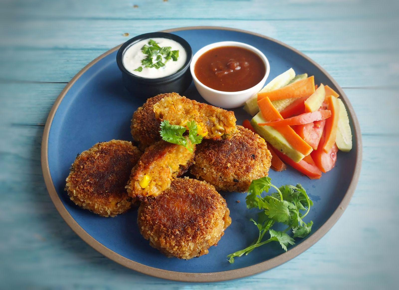 Heat 1 tbsp of oil in a pan and add the sliced onions. Sauté on medium heat until golden and caramelized. Add grated ginger and green chilis and saute for a minute. Add the boiled potatoes, red chili powder, garam masala powder, and salt. Cook for 3-4 minutes or until the potato is well-coated with the masala. Add grated carrot and sweet corn kernels and mix well. In a mixing bowl, combine the grated paneer, potato masala, chopped coriander leaves, and roasted chickpea flour. Shape the mixture into round or oval shapes. Dip each cutlet into the corn flour slurry, then dredge it in breadcrumbs. Refrigerate the coated cutlets for 30 minutes. The moisture from the fridge will help the breadcrumbs adhere better to the cutlets and prevent them from spreading while frying in oil. Shallow-fry or deep-fry the cutlets on medium heat until golden brown and crispy on both sides. Serve hot with tamarind-dates chutney, lemon yogurt dip, and a light salad.