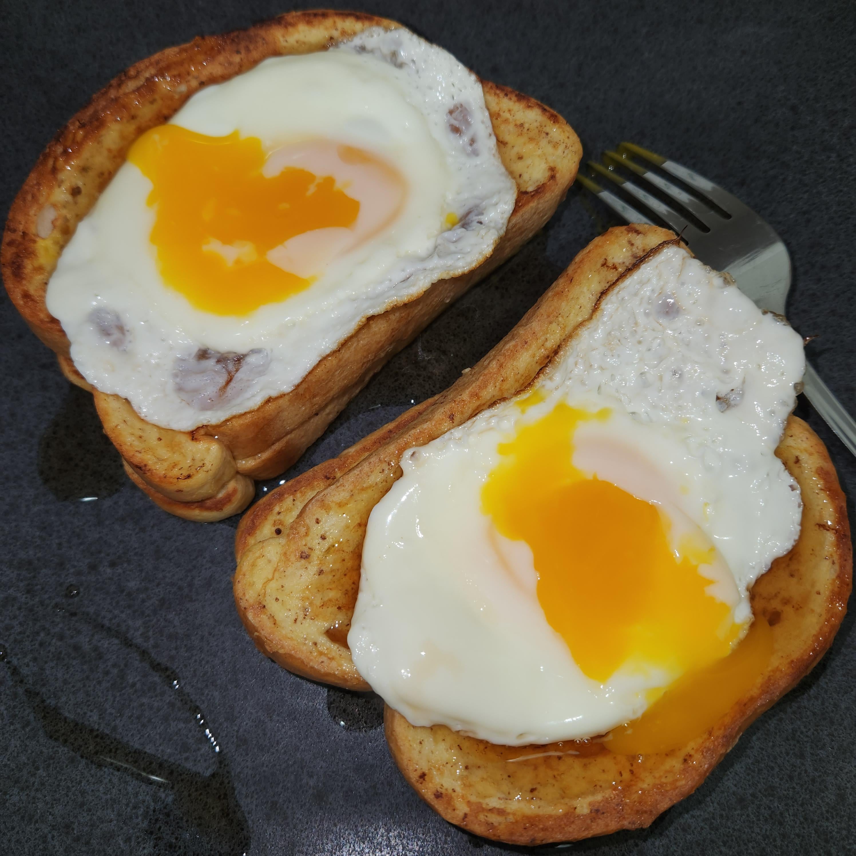 2 eggs for the french toast, 2 for sunny side up. 4 x 70 cals/6g proteins = 280/24g proteins.