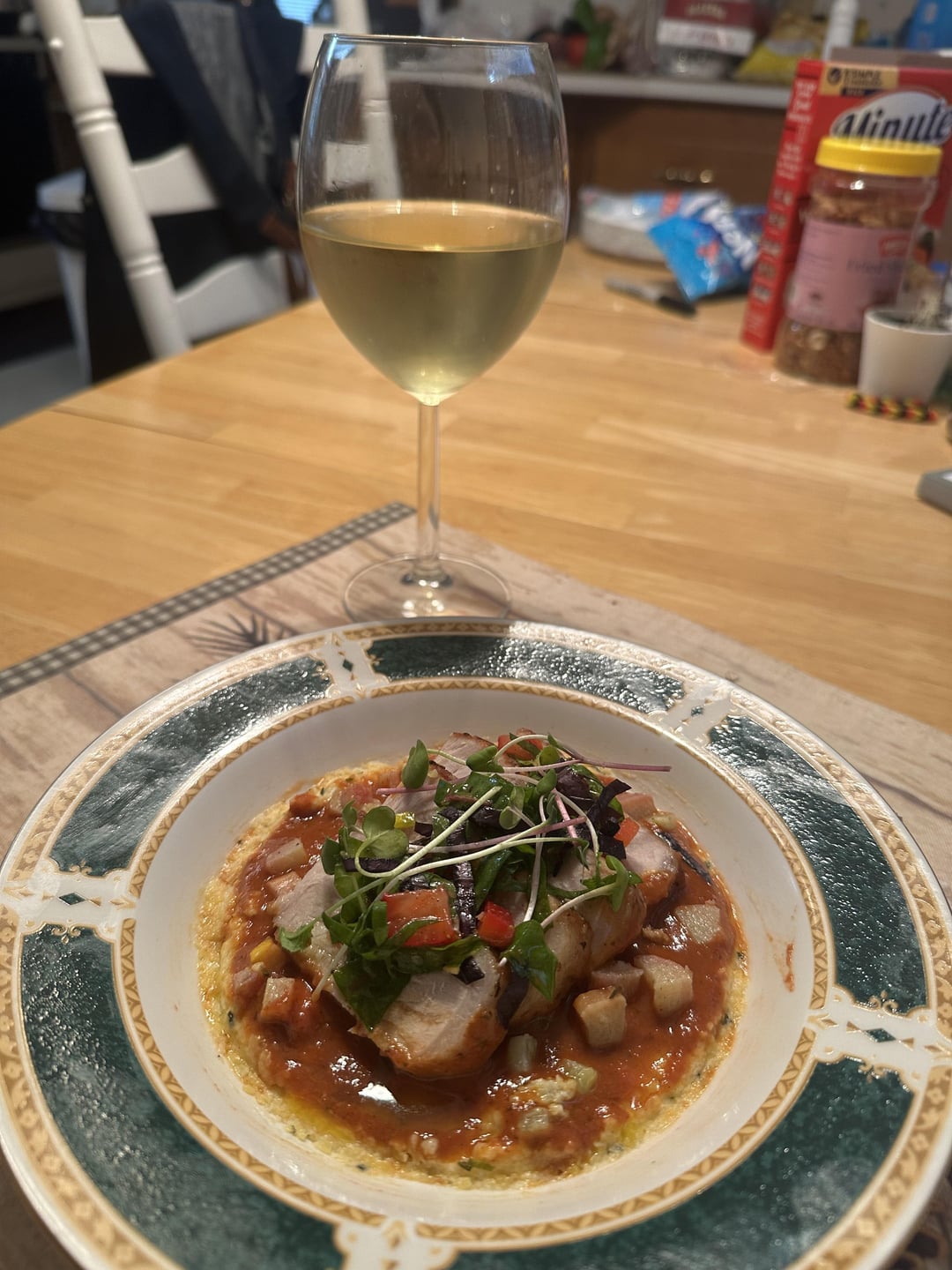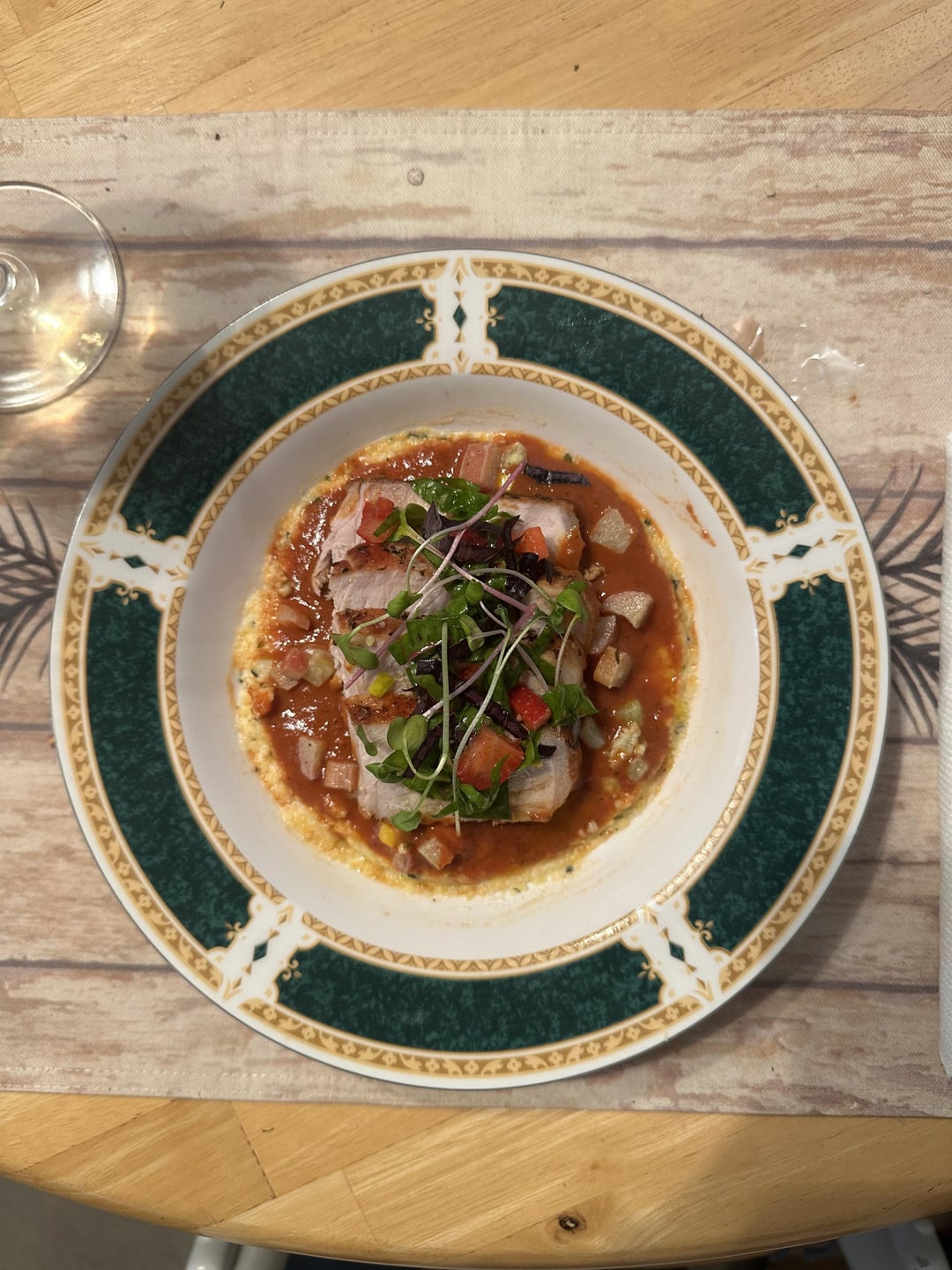 Pork, Basil and Parsley Polenta, Rhubarb/Tomato and Pepper Sauce, sautéed Rhubarb and Squash, Chard and Strawberry Salad dressed with a lemon and Basil vinaigrette, Microgreens.