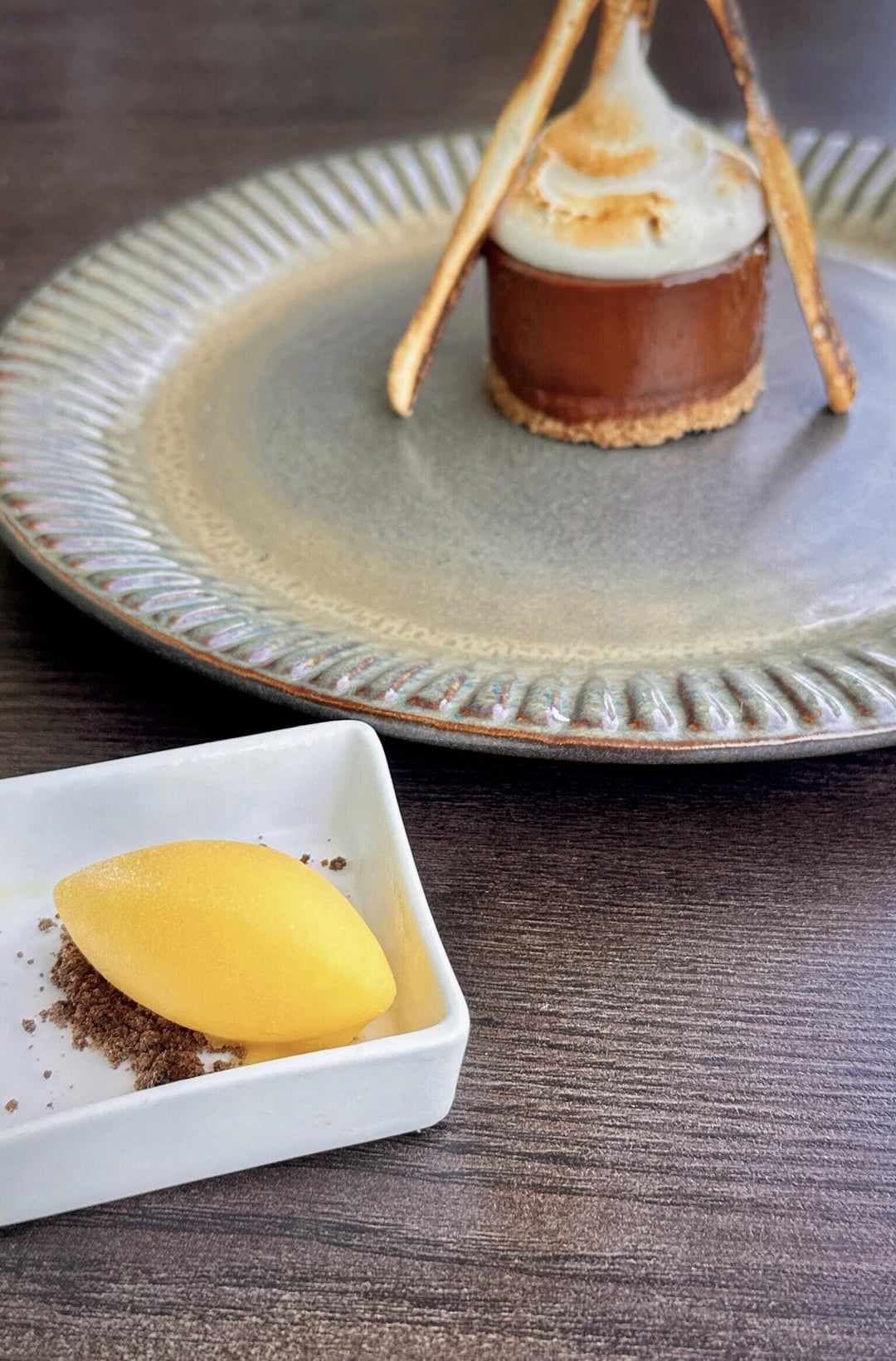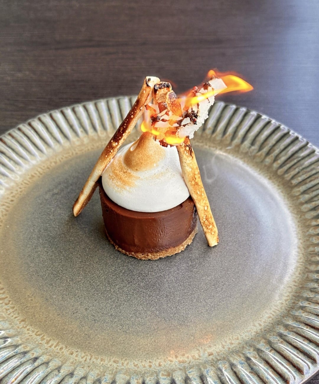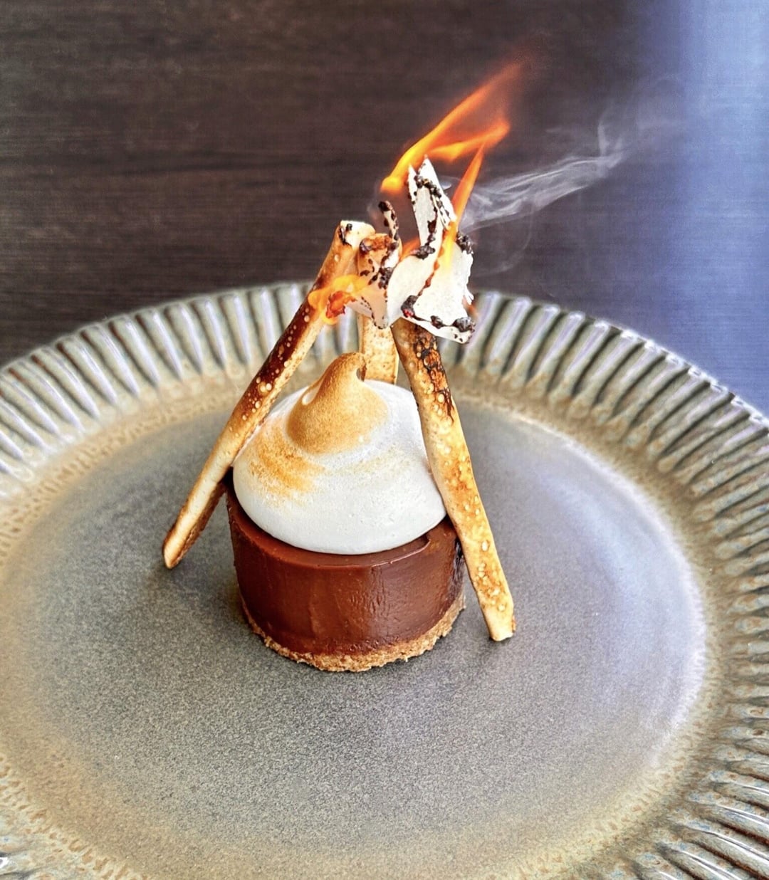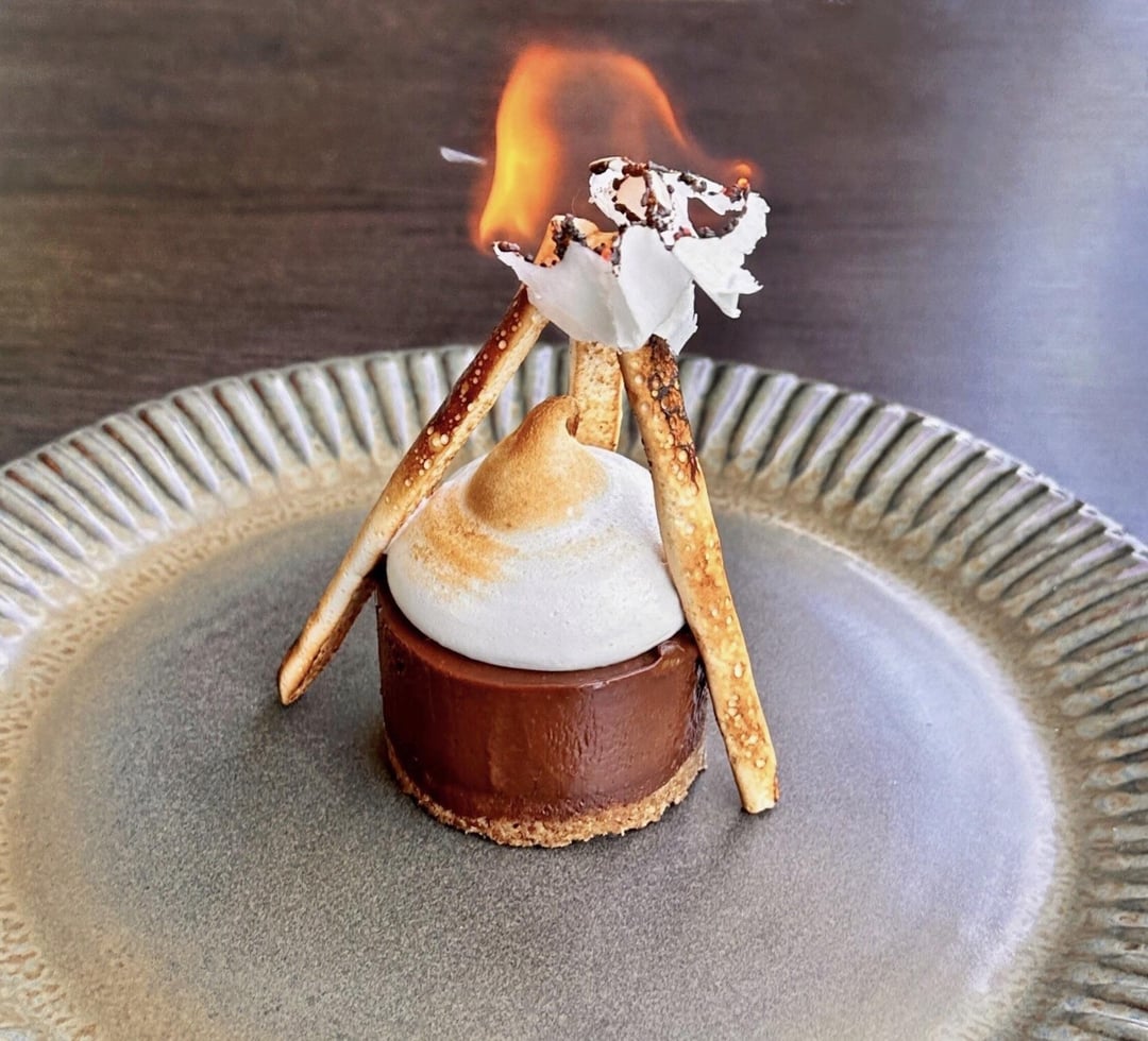I’ve reimagined a classic s’mores with the elevation of fine dining. Russett, oat, and buckwheat crumb, oak smoked chocolate cremeux, bourbon marshmallow fluff, meringue sticks, and wafer paper to garnish and orange sorbet to serve on side.
