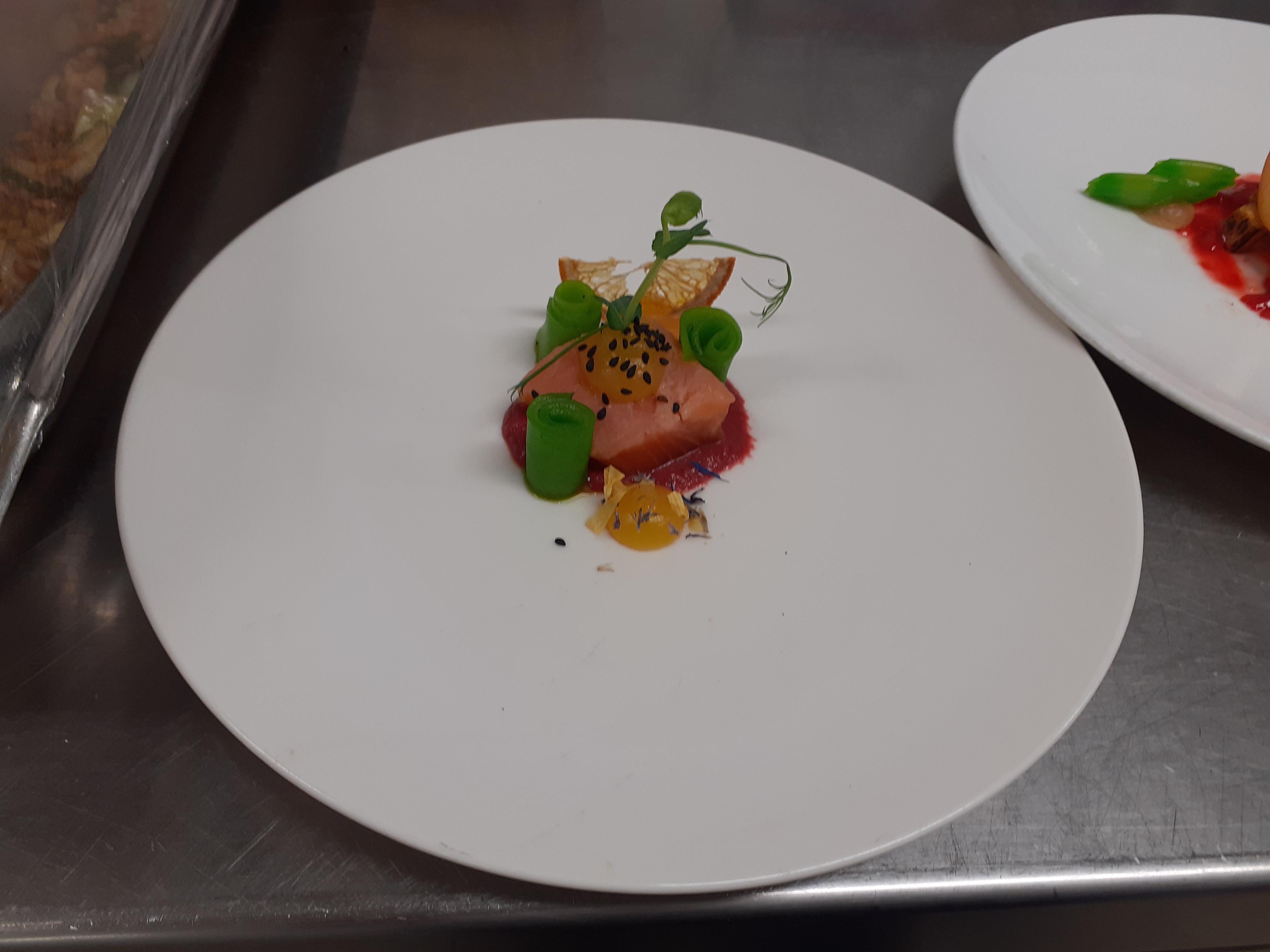 Cured salmon, mango gel, beetroot puree and pickled cucumber by Alone_Broccoli_7037 Culinary Culinary Plating