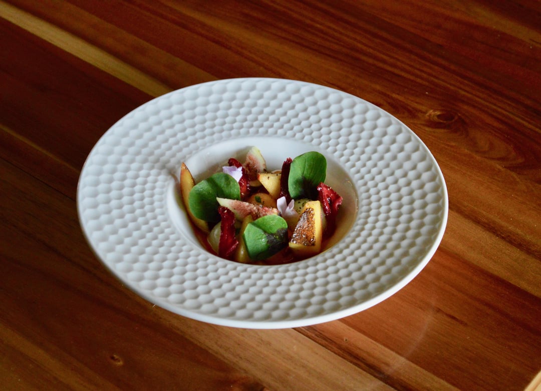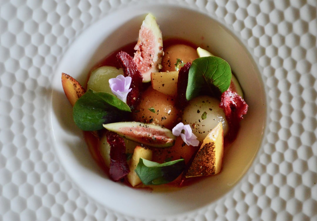 Acting as more of a salad course, here's a list of everything in the bowl. King of the West Orange Melon and Honeydew Melon, compressed with black pepper, lemon thyme, and star anise / grilled Ga Peach / Brown Turkey Fig / Strawberry "Umeboshi" (started early June, berries were packed in salt and sugar for 6 weeks and then dehydrated until chewy) / Blackberry Vinegar / toasted Marigold Oil / Oxalis leaves and flowers