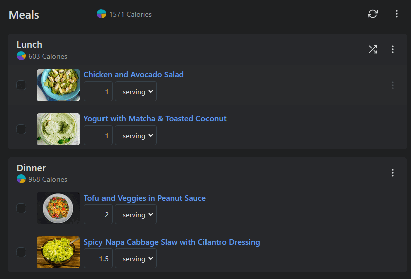 today I started my 1500 calorie diet. I used eatthismuch and picked some recipes I liked. Today I made them and they were delicious! However after inputting everything into my calorie tracking app, it seems after everything was made (lunch and dinner) I actually had 370 calories remaining. I used a scale and measured to the tenth of a gram. For dinner specifically, the recipe had me eat so much I physically could not finish it. I ended up eating around 60% of the dinner recipes and saved them to eat later in the day but honestly was not hungry enough to finish them.
