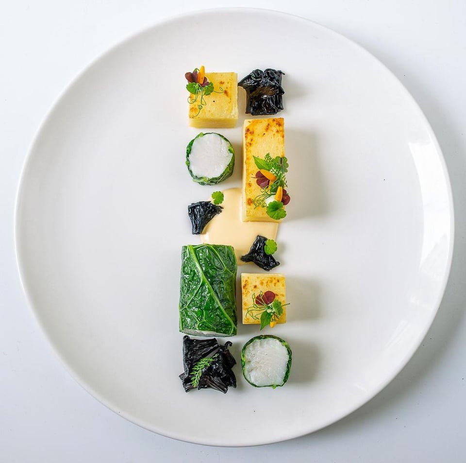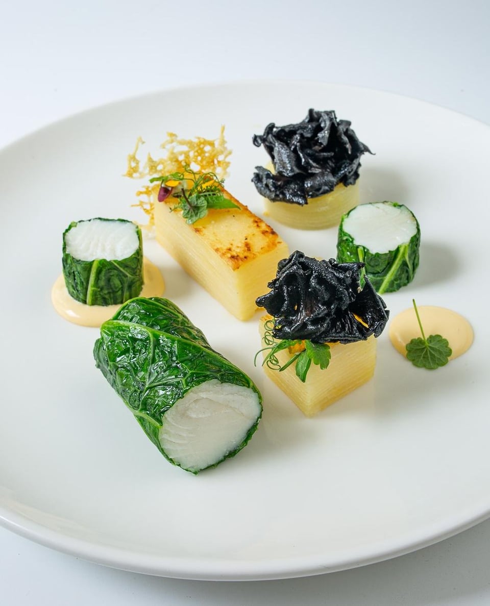 Black halibut, savoy cabbage, black trumpet mushrooms, potatoes au gratin, hollandaise sauce. by Mild-TN Culinary Culinary Plating