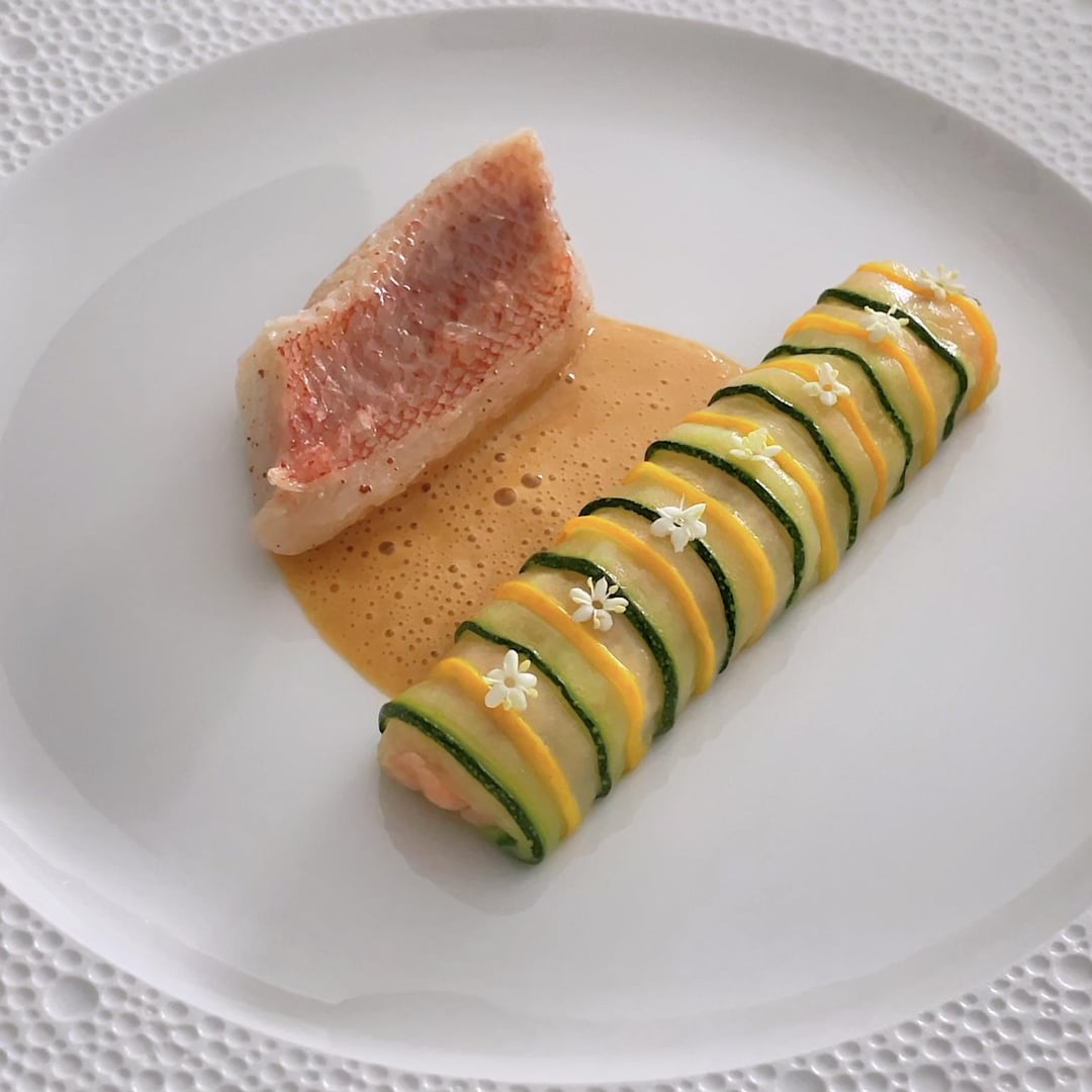 Japanese Kinki fish (cured & gently cooked in brown butter emulsion), shrimp sauce & zucchini cannelloni stuffed with shrimps & fish trimmings