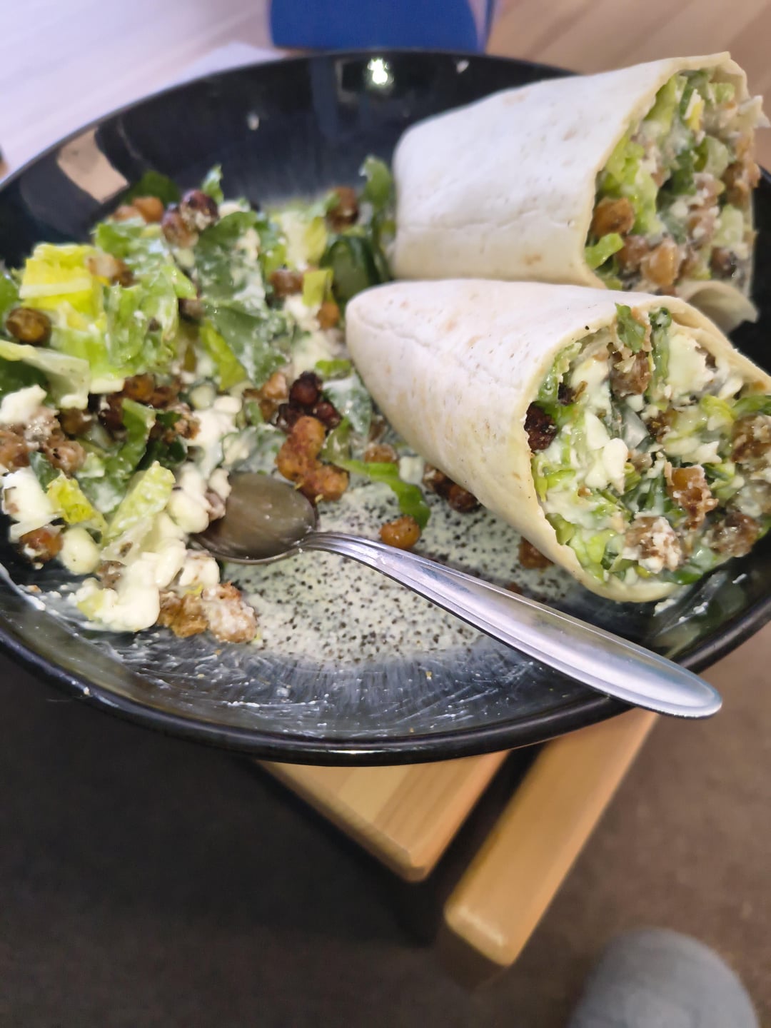 36g protein, 26g fibre on the plate (high fiber wrap does a lot of heavy lifting here yes). A bit salty, because I seasoned my chickpeas for snacking like crisps until I was sidetracked into doing this a couple days later, but I think now I'll make this a regular thing.
