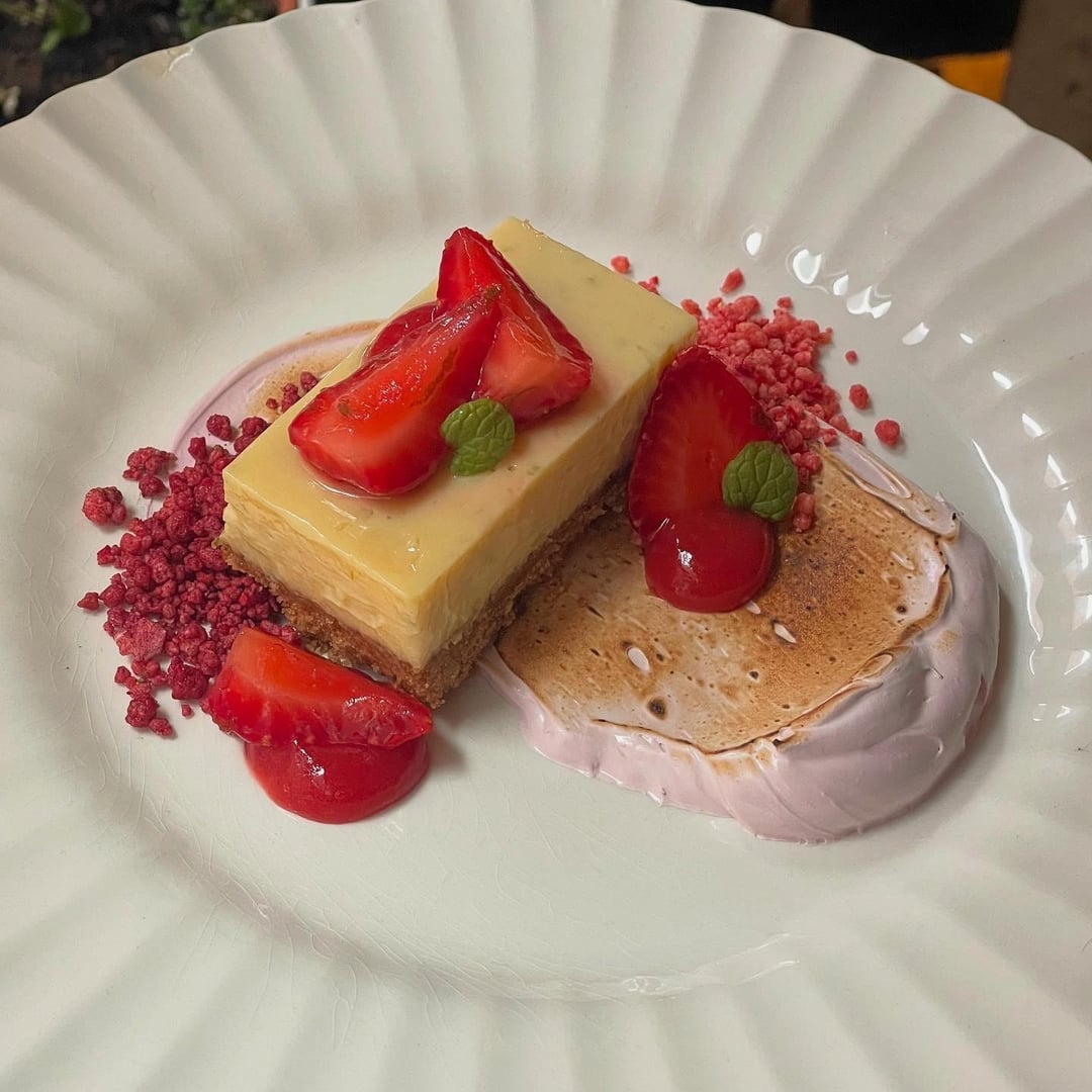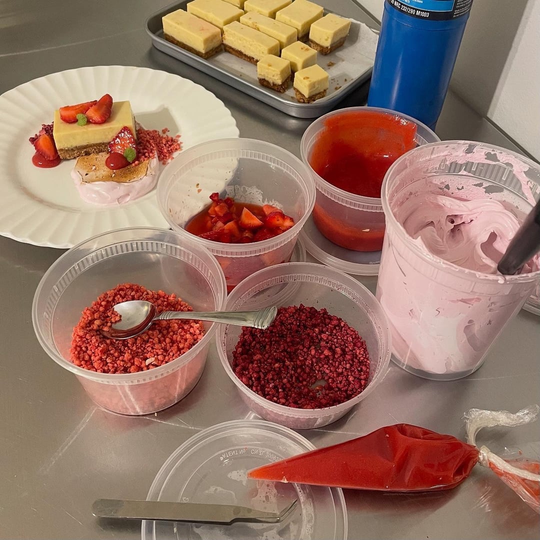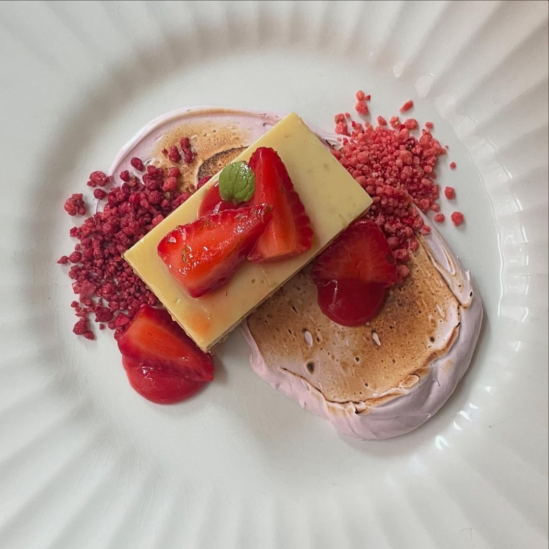 Lime curd + honey speculoos crust, toasted hibiscus honey meringue, honey + lime macerated strawberries, strawberry gel, strawberry + hibiscus milk crumbs