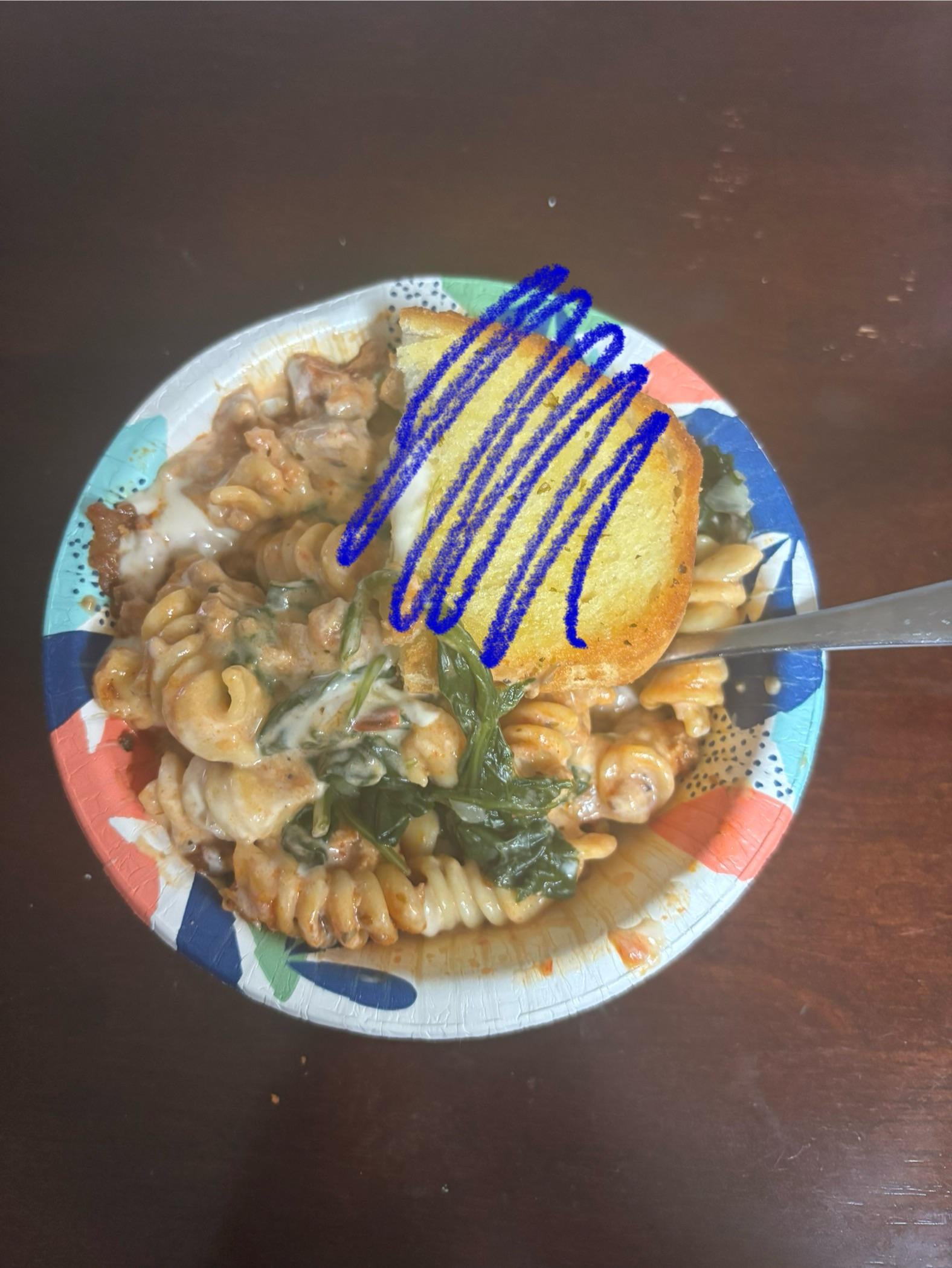 it’s pasta and spinach— ignore the garlic bread, i didn’t eat it, i just replaced it with more spinach. i know it looks disgusting but it didn’t taste that bad.