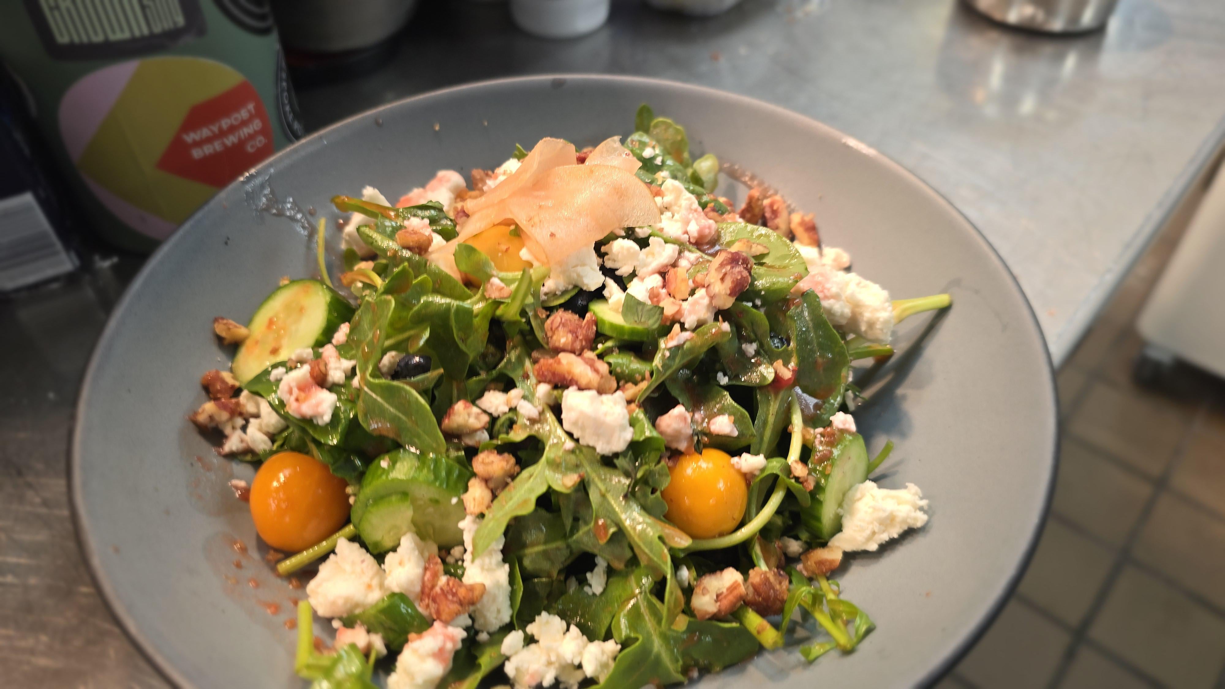 Delicious summer time salad. Arugula and spinach for the salad base. Tossed with blueberries. Adding cucumbers, gooseberry, feta, pickled apples, candied pecans, and of course chocolate mint. All tied with a strawberry vinaigrette. I absolutely loved this salad the flavors paired amazingly well hoping to get it put on the menu.