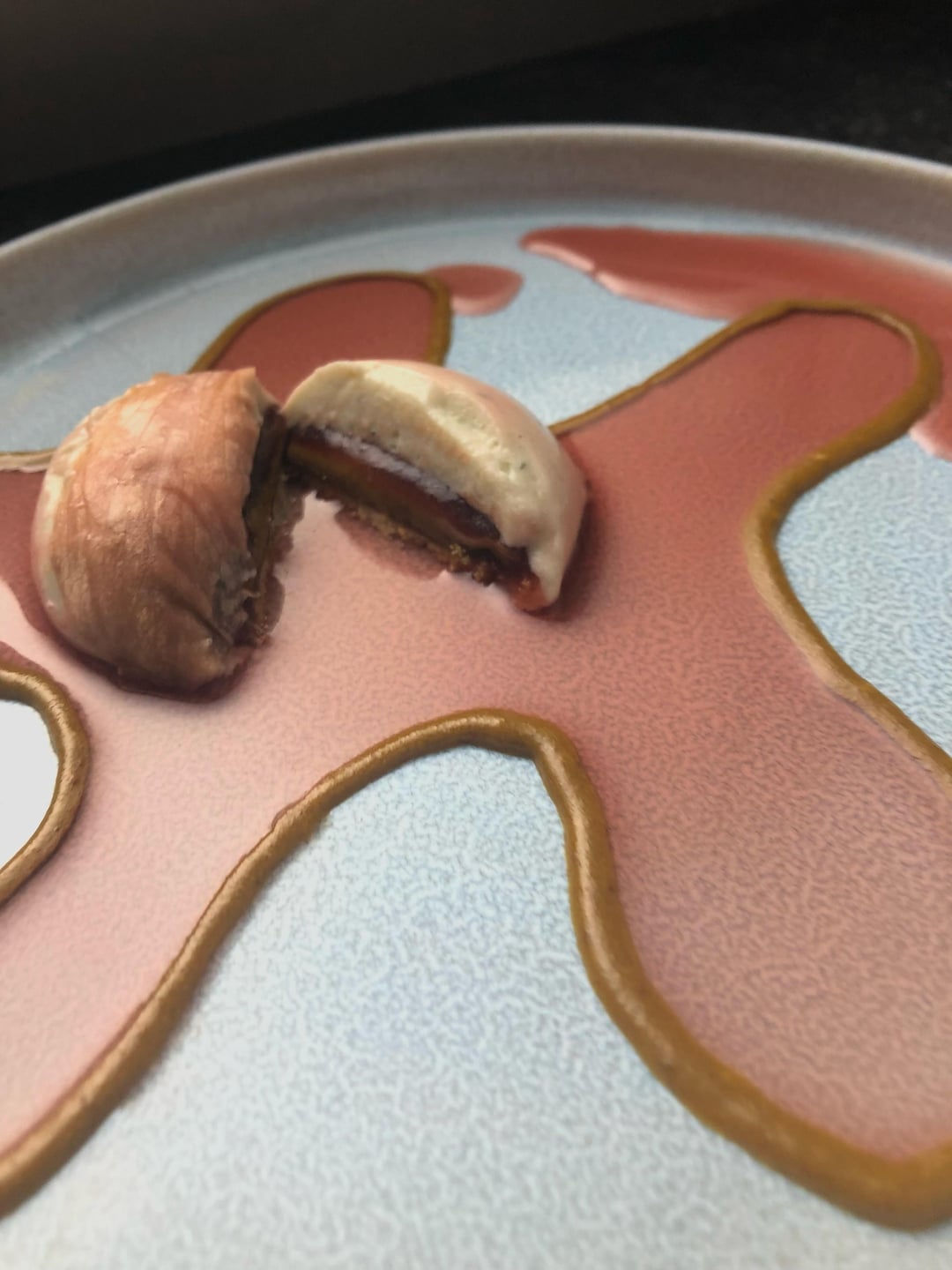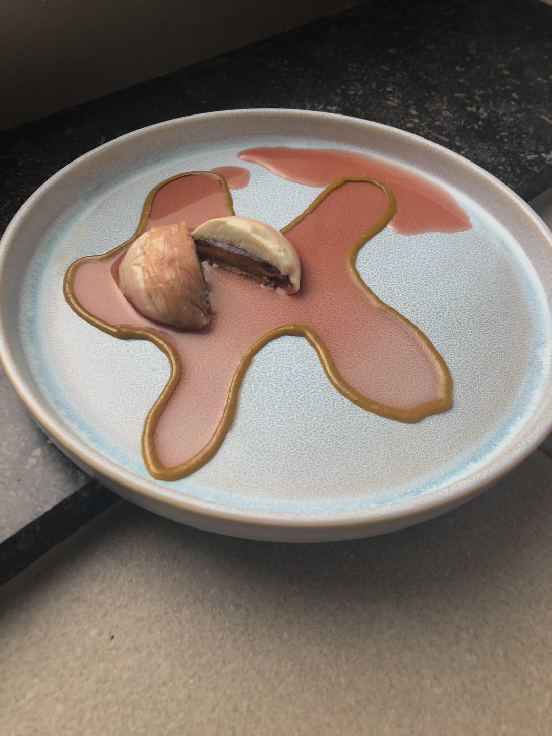 A strawberry centre, sweet roquefort mousse, magnolia nappé and sirop, hazelnut praliné and sablé cookie (french cooking background, hopefully you guys understand) by PopularJellyfish7121 Culinary Culinary Plating