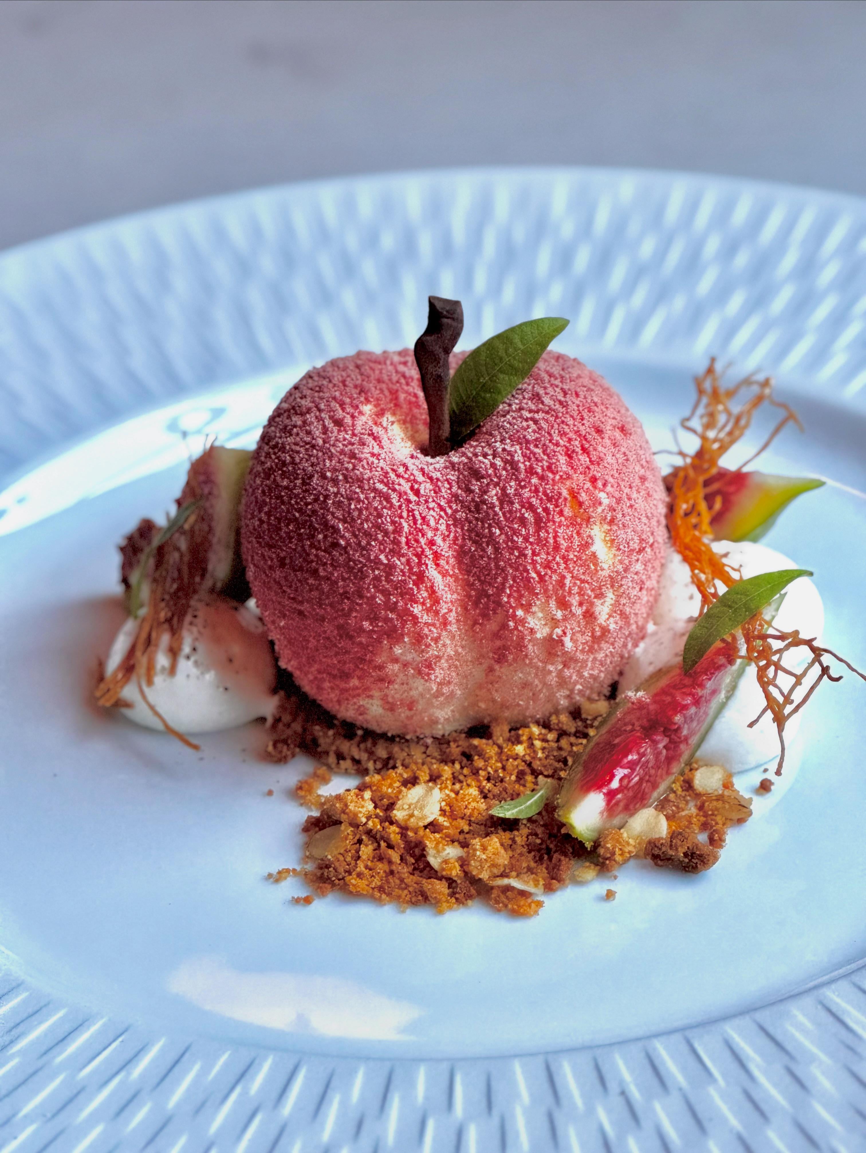 Vanilla Crème Fraiche mousse with peach compote center & fresh figs by Alterris Culinary Culinary Plating