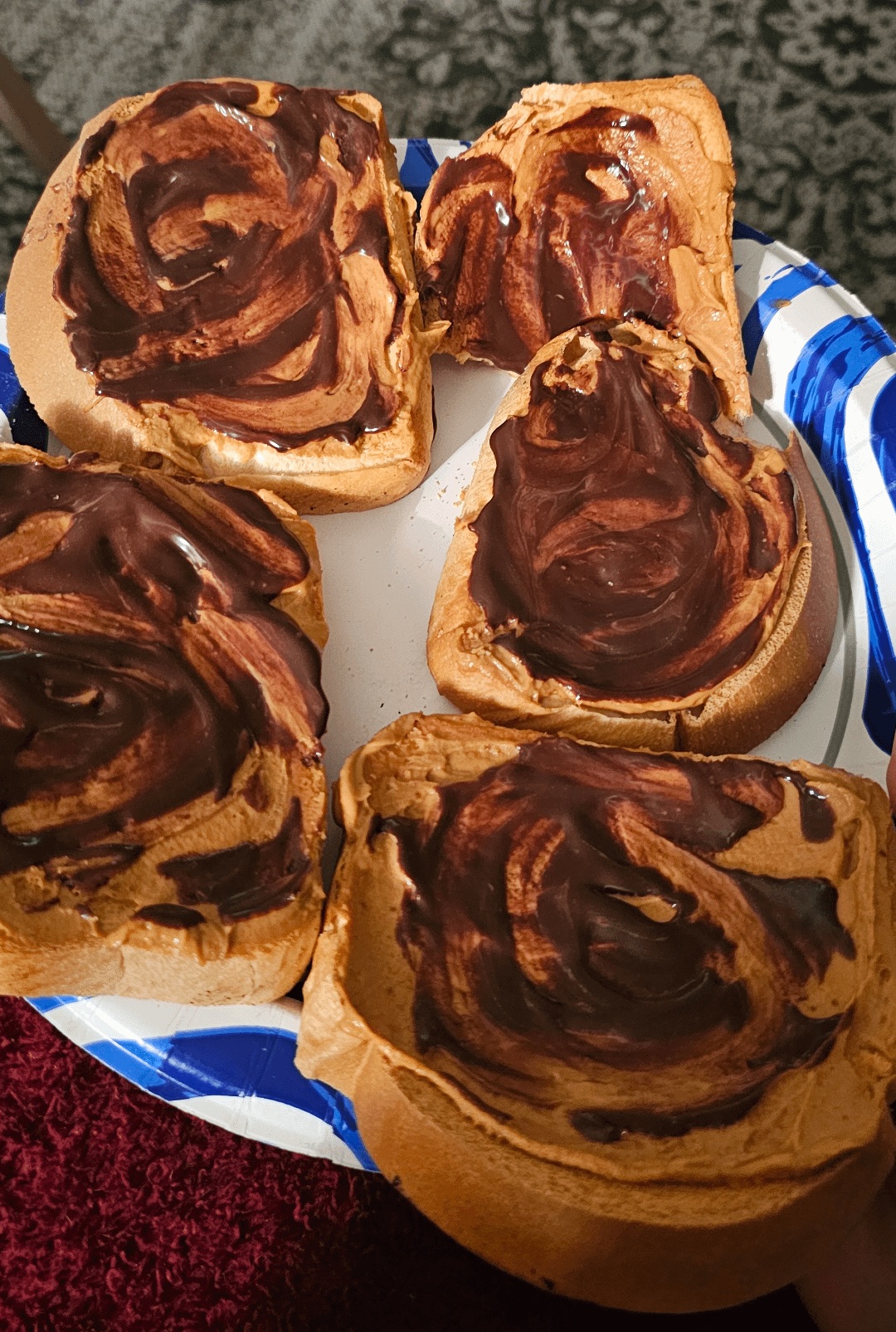Usually 4 slices of nature owns ket bread, 48 grams of pbfit and a tbsp of zers sugar hershy chocolate syrup. A small droplet of syrup id enough ad u just smear it on the bread.