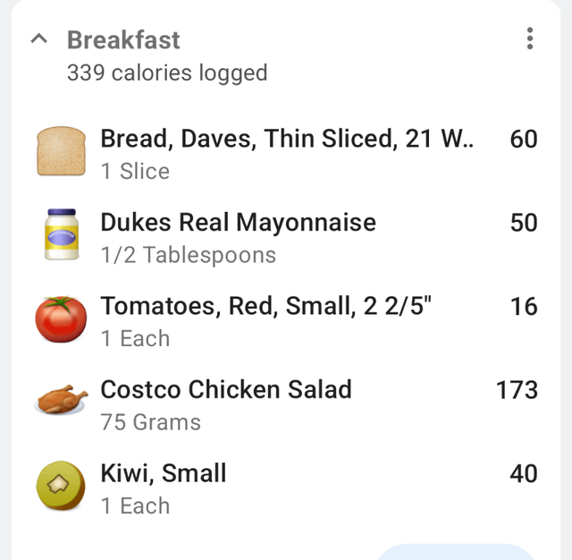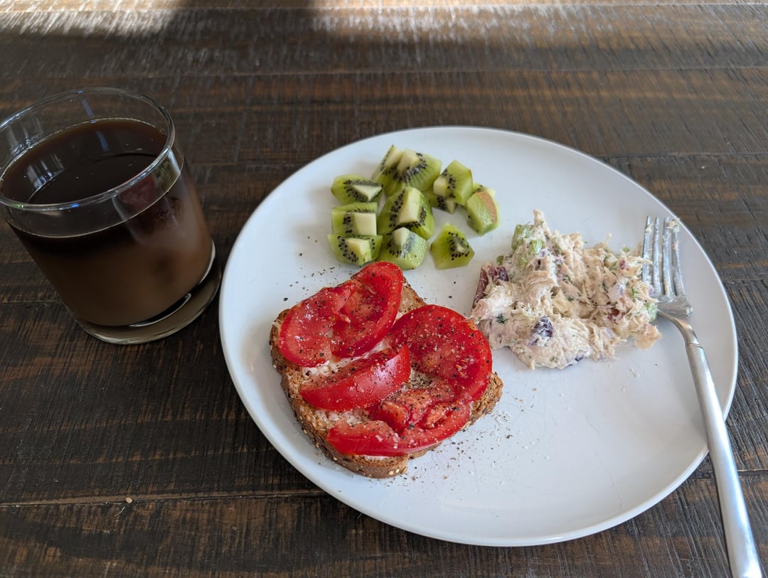 kiwi, chicken salad, tomato on toast with mayo and salt and pepper –> swipe for cal breakdown