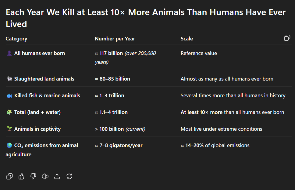 While these numbers/figures are far from completely accurate, it all boils down to a numbers issue. Humans need to eat and because of our big brains we need a high caloric/fat intake. We also through the fact of having awareness, have desire for variety in our diet. All of that means a ridiculous amount of food is needed to be produced. Even if every human was vegetarian/vegan for the last 200k years we would still have major issues with how and what we were producing and eating. Yes they wouldn’t be animals, but we would have used so much land to produce the 4 to 5 billion metric tons a year needed. Which would probably be even higher the we could guestimate.