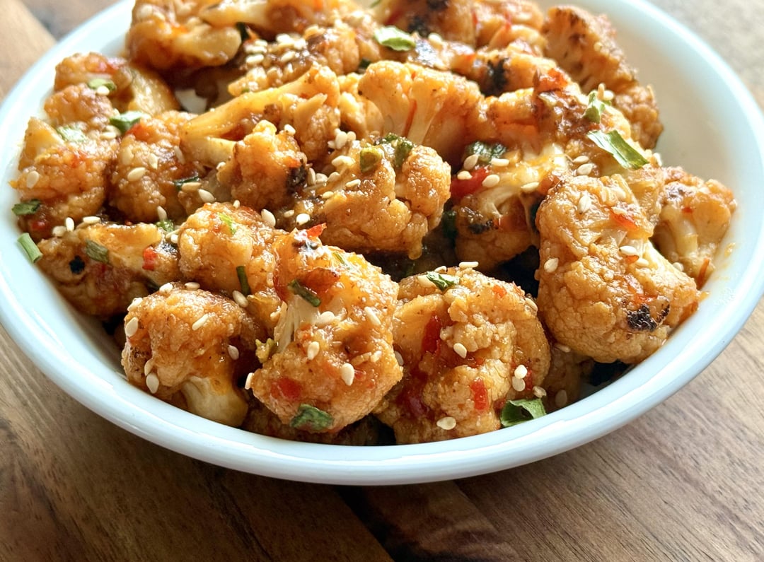 Cauliflower – 1 medium head, 4 to 5 fresh garlic cloves, 2 teaspoons of freshly grated ginger, Spicy Sambal Olek 2 tablespoons, brown sugar 3 tablespoons, toasted sesame oil 2 tablespoons, freeze dried chives 2 tablespoons, sesame seeds 2 tablespoons, cooking oil 3 tablespoons, 3 teaspoons lemon juice, salt to taste.