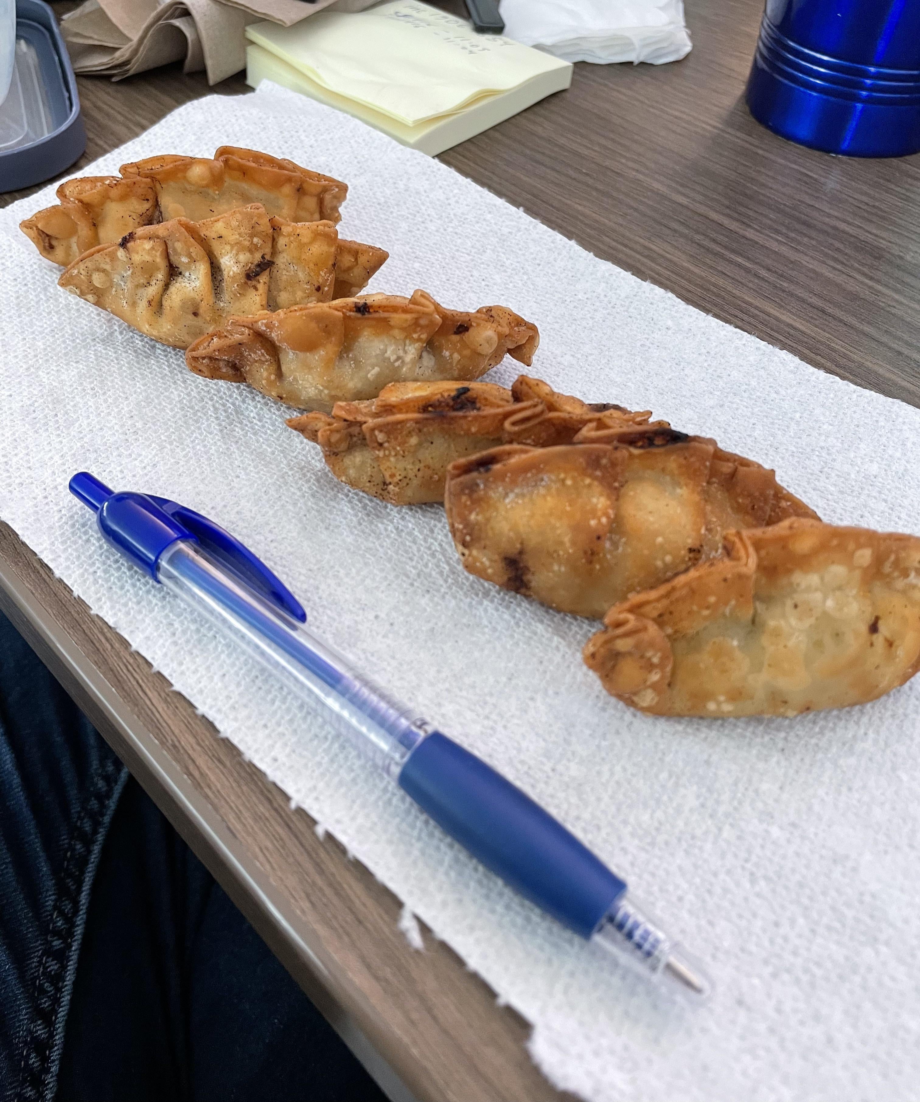 They’ve been the perfect lunch option either steamed or pan fried. The wrapper is 20 calories of carbs and the filling is 22 calories of mostly protein. If fried, this adds about 1.73 grams of oil or 15.5 calories of fat. I came to this number by weighing the oil before and after frying so hopefully that was pretty accurate.