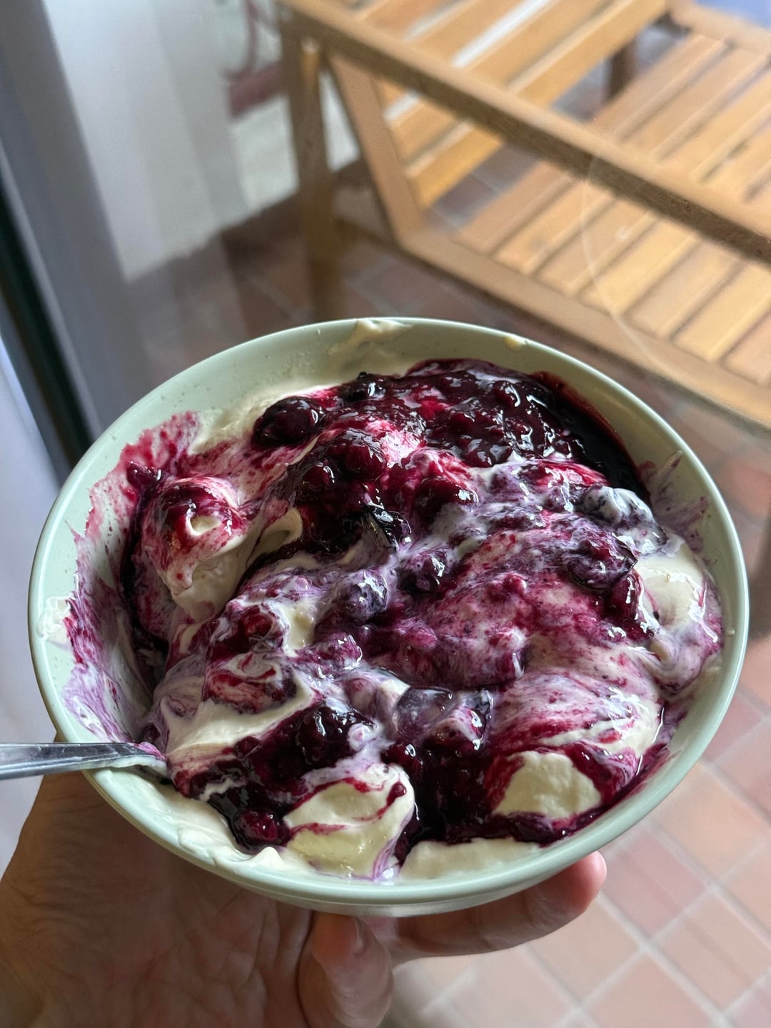 Dinner is a massive sweet bowl. Base is ricotta bake (ricotta, whey isolate, egg whites), cubed and topped with cottage cheese/whey isolate/frozen mango, and homemade jam (kiwi, plum and blueberries microwaved for 10min).