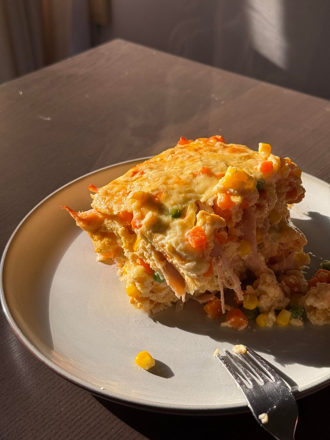 Breakfast is smoked turkey breast and veggies baked in egg/egg white/cottage cheese mixture and topped with mozzarella.