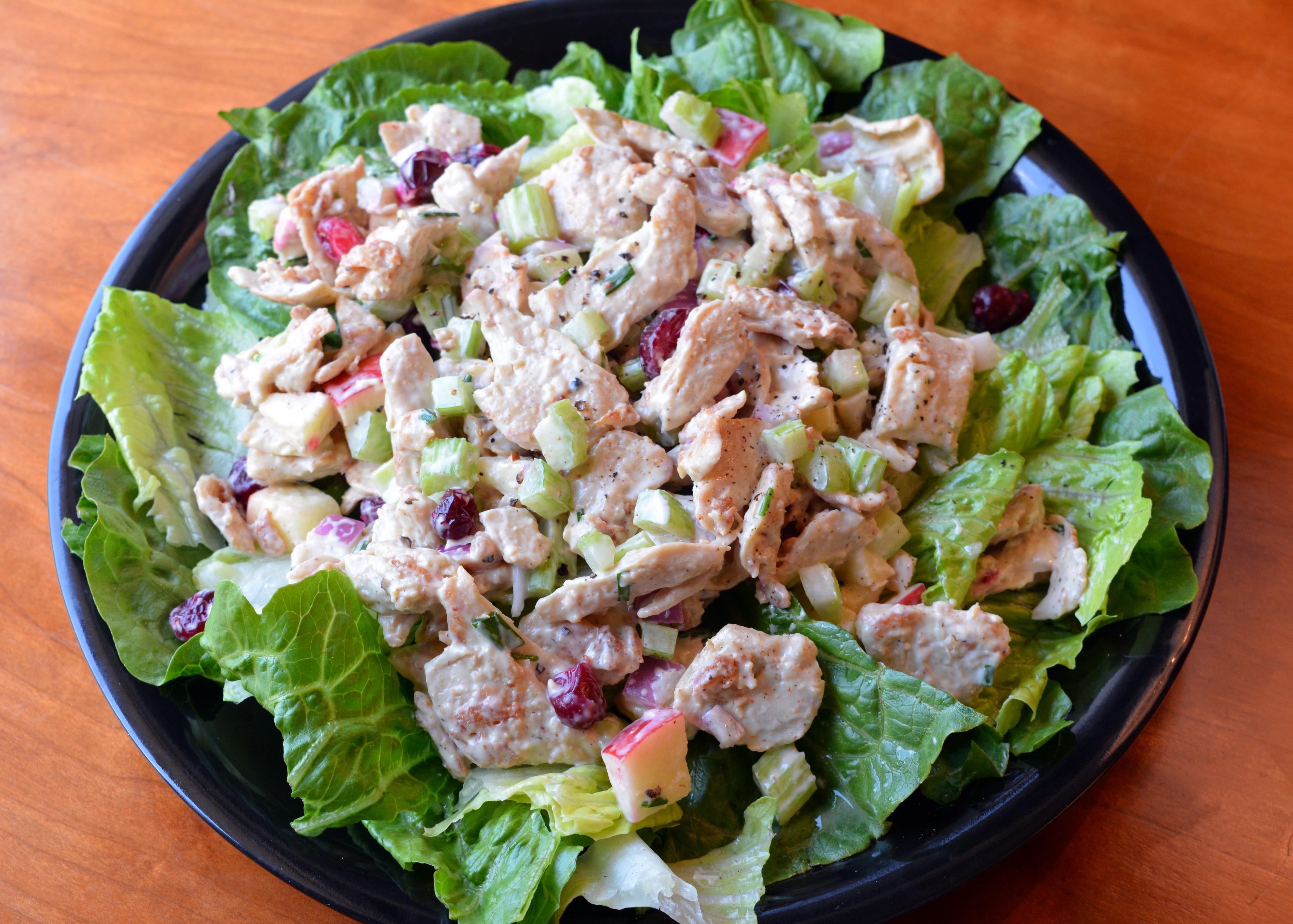 Beyond chicken pieces, celery, apple, cranberry (pre-cooked in microwave), romaine lettuce, vegan yogurt, lemon juice, tarragon, chives, sweetener, salt, pepper, dash of onion and garlic powders. If you don't have cranberries you can use grapes (less tart, but still really good).