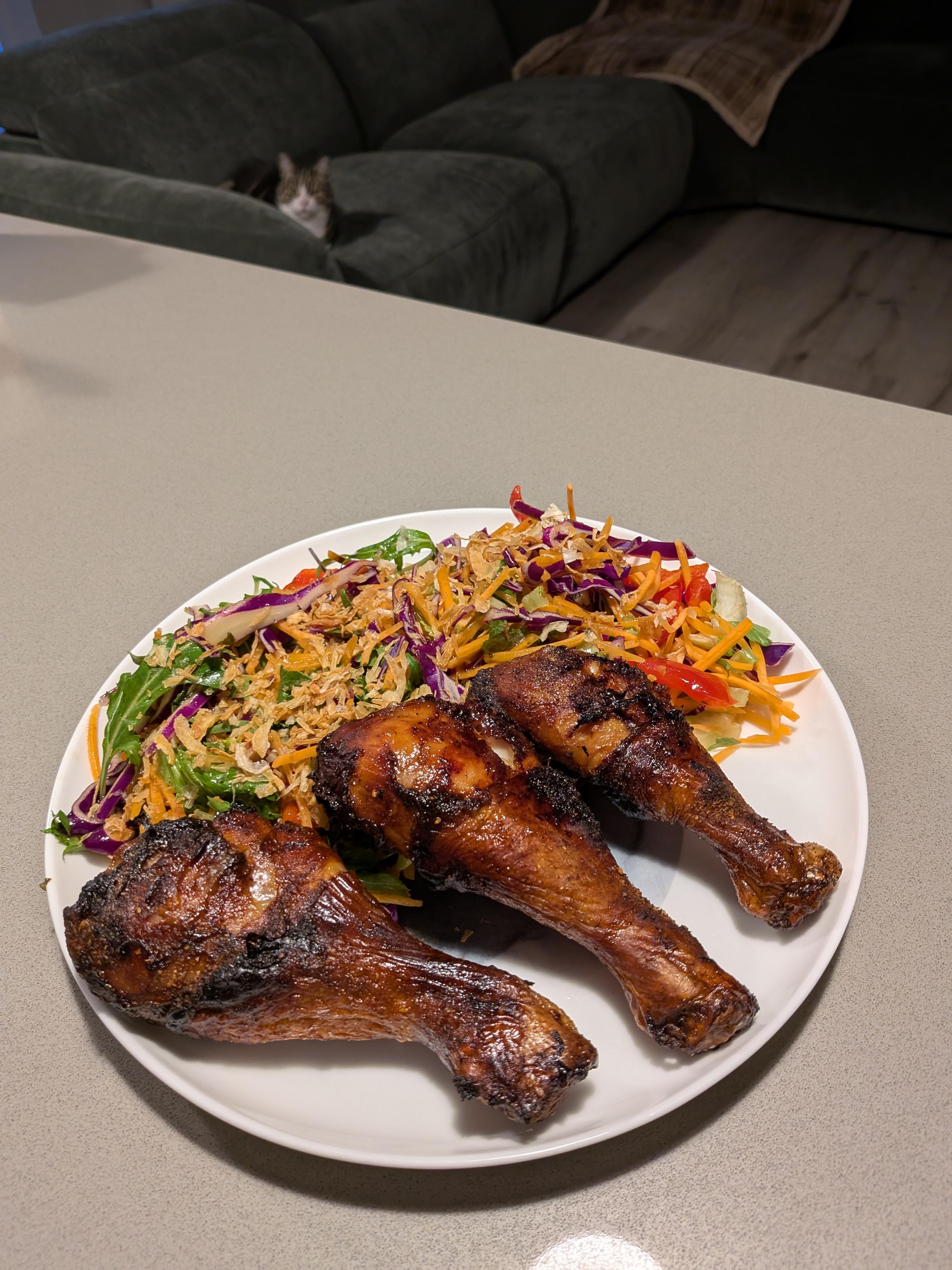 Apparently the drumsticks are roughly 150 cal each, and I dust them with my own Szechuan salt (which is 10/10 for a little tang) from a boutique brand here in the Adelaide hills called salt gang, the salad is pre packaged and is 200 for the whole bag + dressing and fried onions
